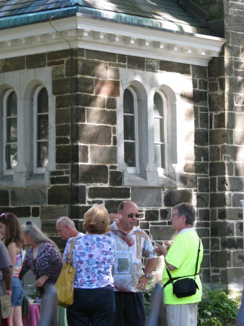 showing off artfully in the Stockade » Karen Johnson chats near the St. George’s food court – 60th Annual Stockade Villagers’ Outdoor Art Show – Schenectady NY – 10Sep2011