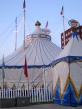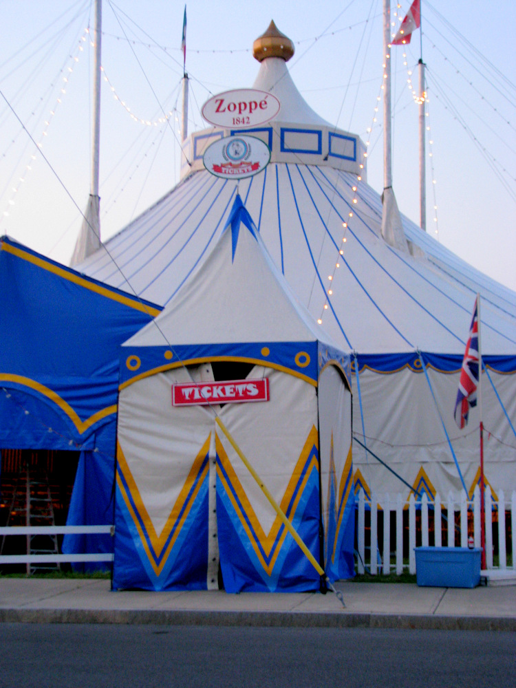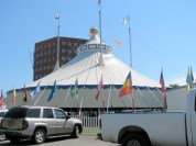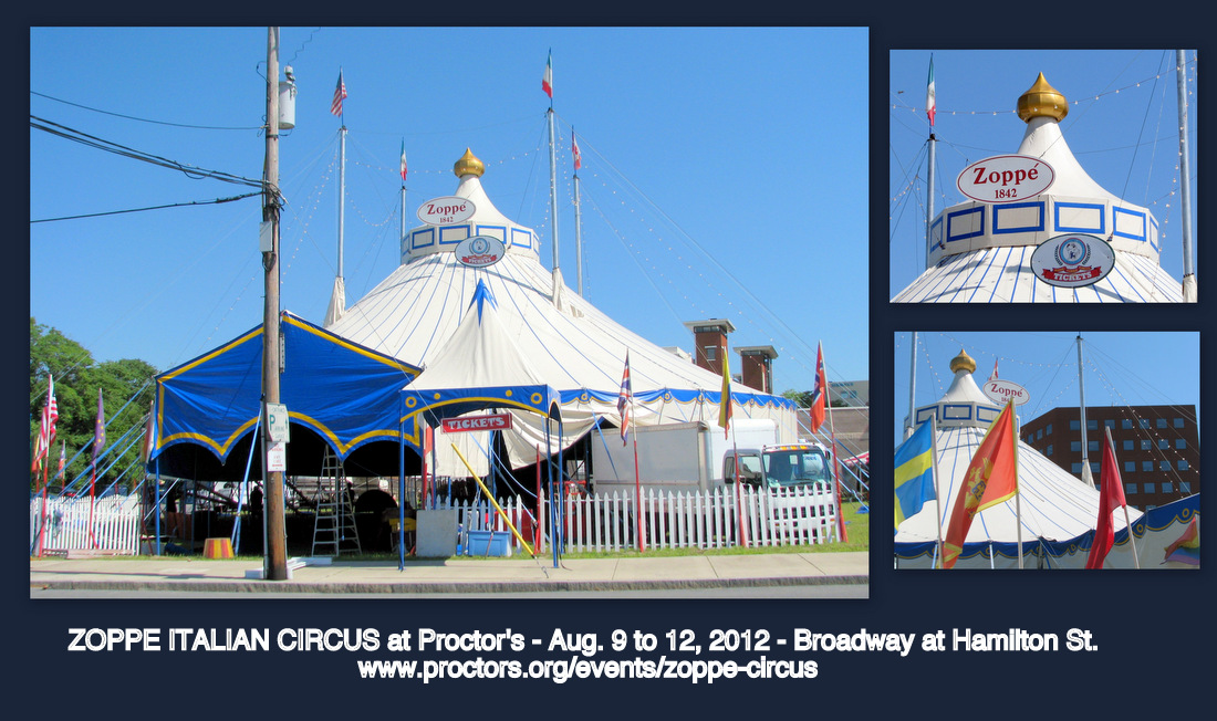 The old-fashioned Zoppe Italian Circus has taken over the lot at the corner of Broadway and Hamilton Street, for its 4-day Proctor’s run (August 9 to 12, 2012). A teaser in today’s Schenectady Gazette got me out around 11 A.M. to the corner of Broadway and Hamilton St. under a blue sky to see the European-style big-top tent, which is 56 feet high and seats 500 people. (See “Big top goes up as Italian circus prepares for weekend visit”, p. B5, by Terance Haight, Aug. 8, 2012)