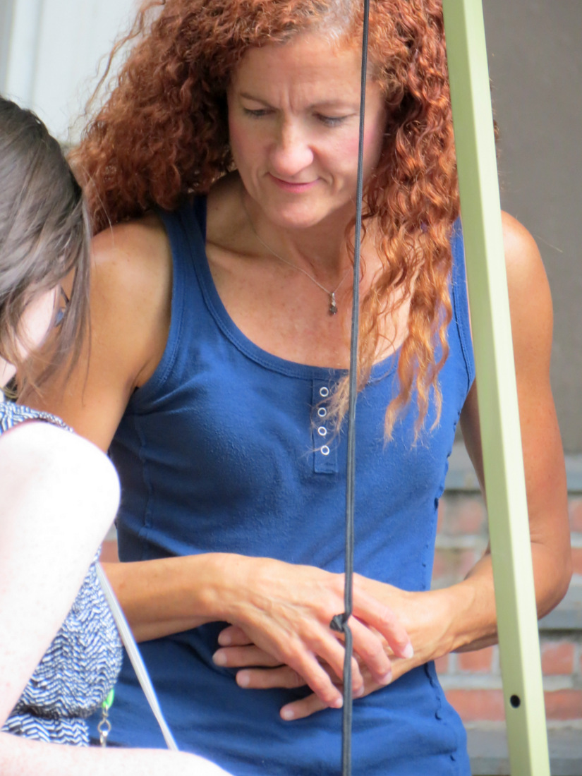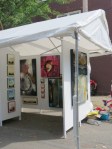 The 2012 Outdoor Art Show will surely be remembered for the nagging wind that required constant vigilance to protect the assembled artwork and people. Jeffrey Bisaillon‘s piece “Coastal Front” is at the head of the paragraph and sets the tone. Mabel Leon’s hands-on efforts (below) at securing her art is representative of the efforts of many other of the exhibitors: