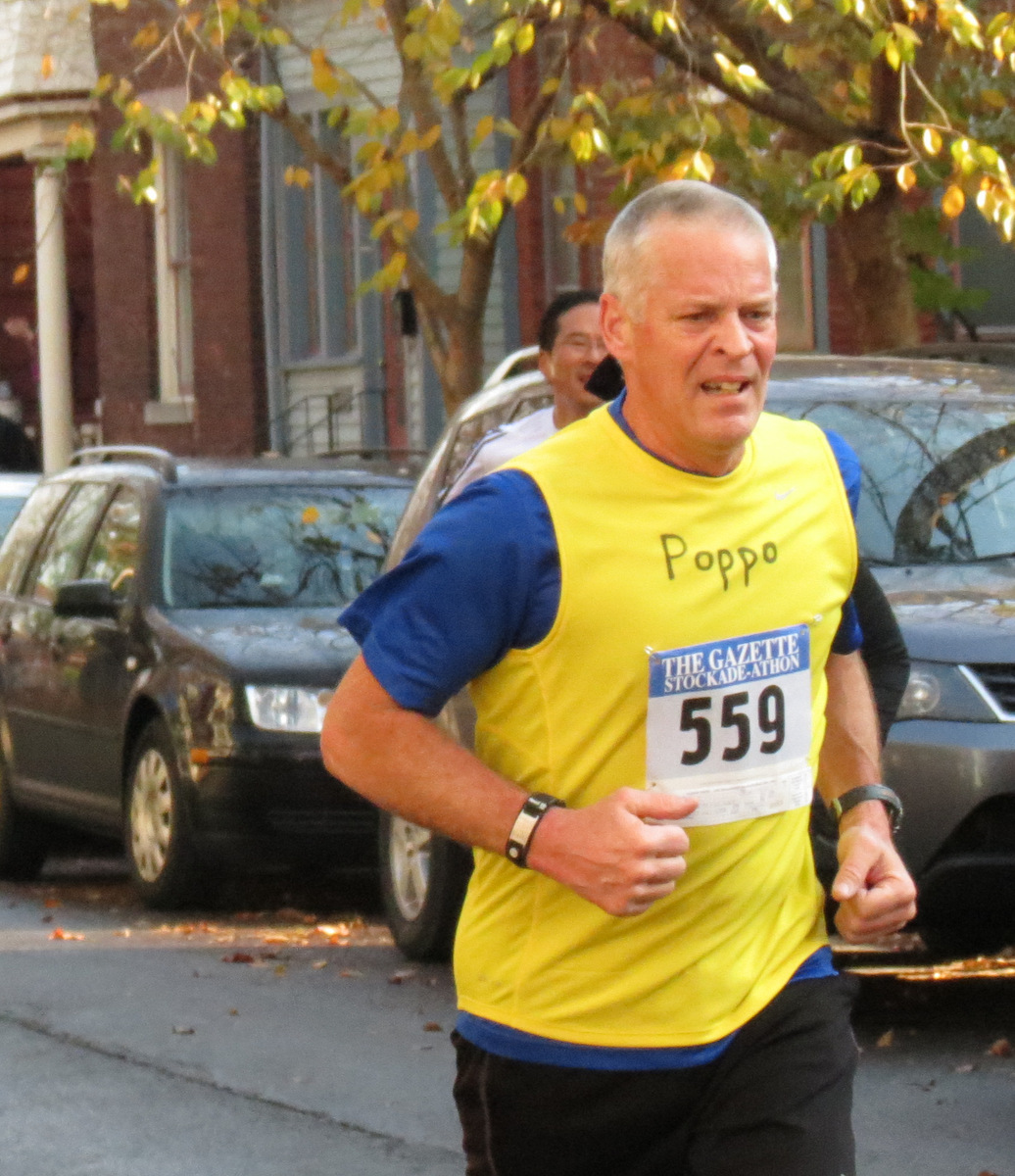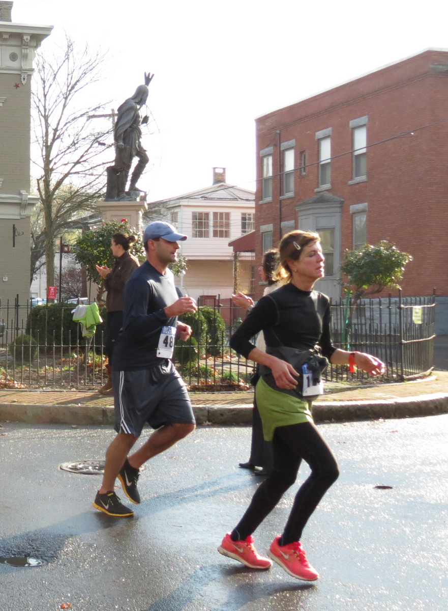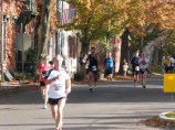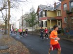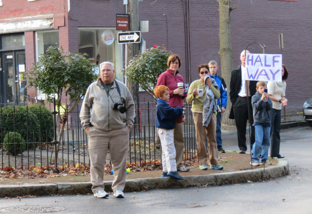 Stockade-athon 2012, the 37th annual version of this 15k [9.3mile] race, takes place on Veterans Day this year. You can expect the streets of the Stockade neighborhood to be lined with cheering fans, flags, ringing bells, and (often tongue-in-cheek) welcome signs this morning. Lawrence the Indian’s Circle is approximately the halfway point of the race and attracts the most spectators. We don’t have the gorgeous autumn foliage seen the past three years, and the sun hasn’t punched through the clouds yet, but that won’t stop the enthusiasm.