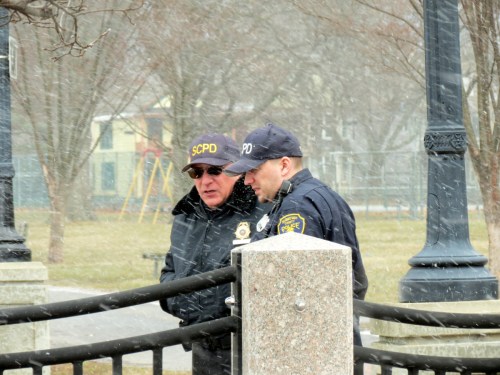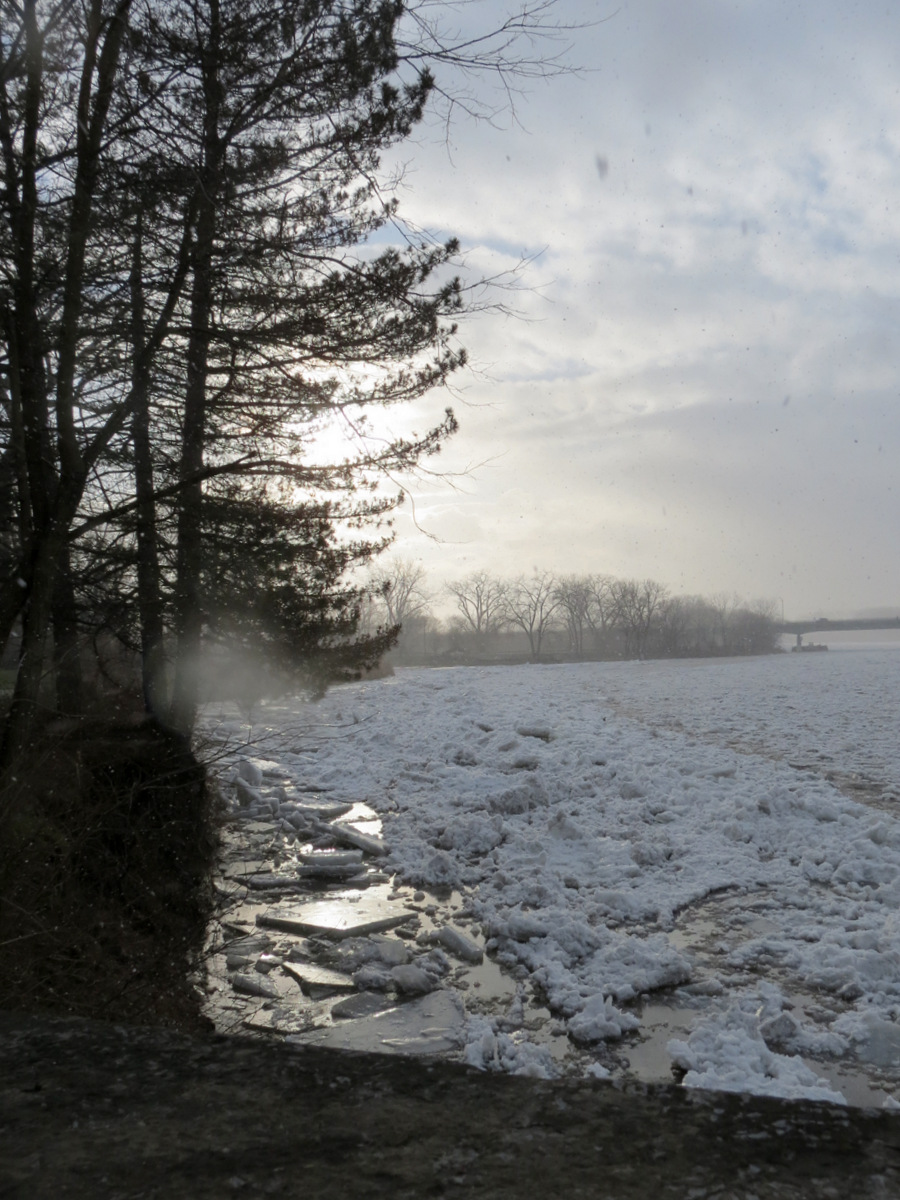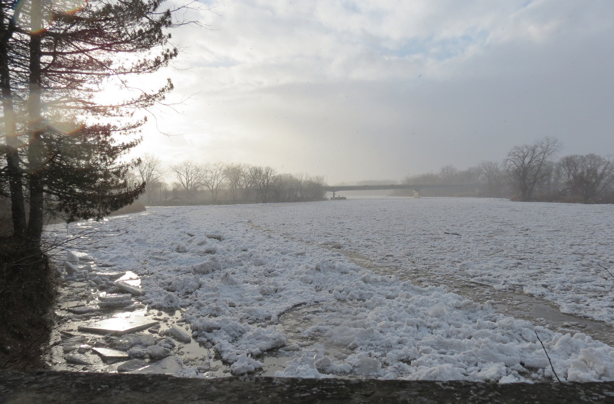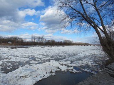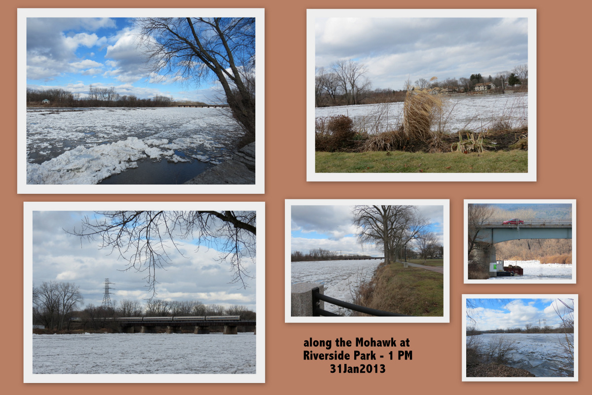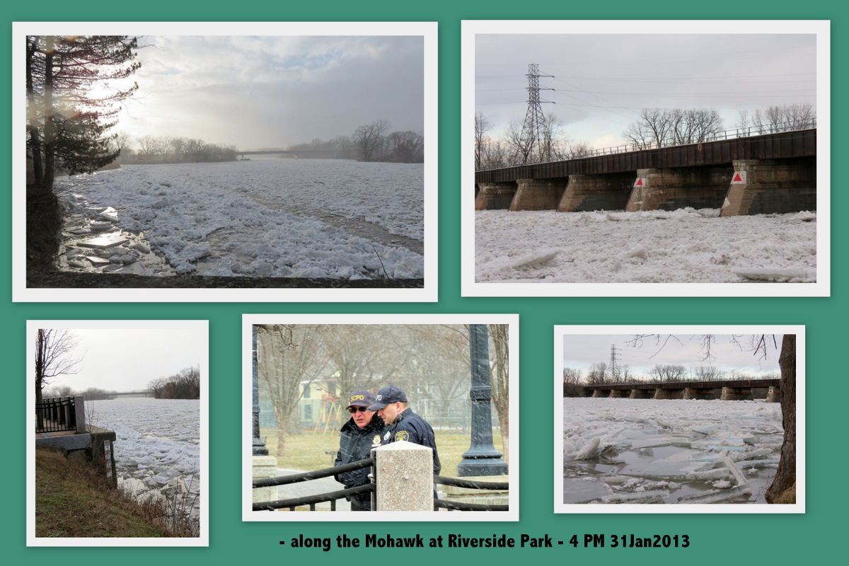 Despite heavy rain and melting snow, the break-up of a relatively thin layer of ice probably helped us to avoid major ice jamming and resultant flooding today along the Stockade portion of the Mohawk River. Ice accumulated along the banks, but there has been no major jamming at the CSX trestle and so no back-up and flooding. The slideshow below has photos taken today (Thursday, January 31, 2013) around 1 PM and then around 4 PM in Riverside Park and at the dead end of Washington Avenue. [update (Friday 8 AM): Water levels went down all night and the flood threat has passed.]