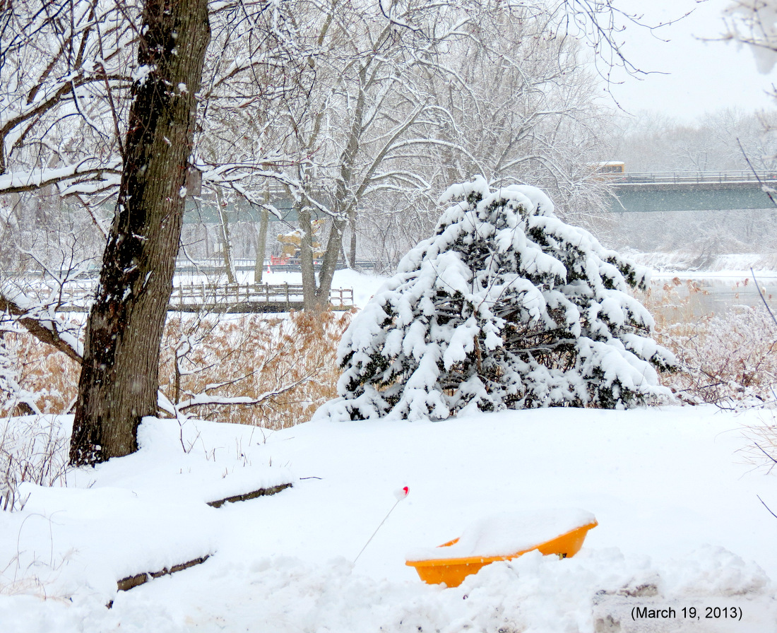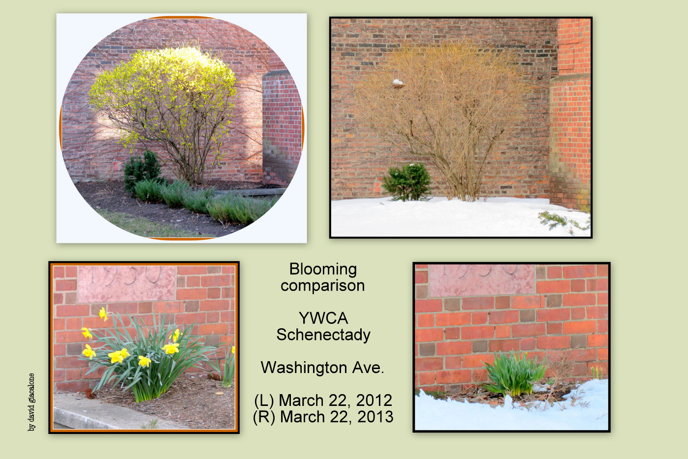 A year ago today, Washington Avenue surprised us with premature blooms on cherry trees, forsythia bushes, magnolia trees, daffodil plants, and more, due to a week of extraordinarily warm March weather. We posted about the event in “early heat brings early blossoms” (March 22, 2012). Today’s expected temperature high is 44 degrees lower than last year, when we had the record high of 81 degrees. Here are two comparison collages (double-click on each for a larger version):