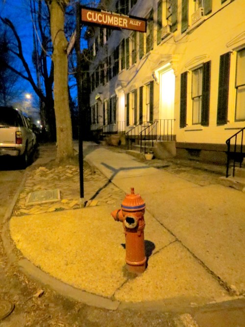 April s&t » a damaged fire hydrant seen at dusk at the corner of Washington Ave. and Cucumber Alley in the Schenectady Stockade – 15Apr2013