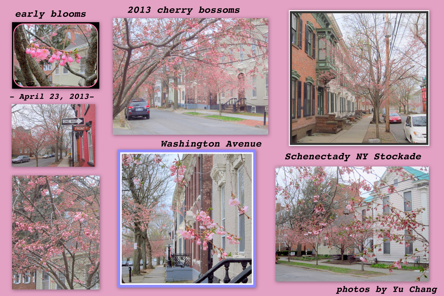 a collage of photos taken by Yu Change of the earliest cherry blossoms along Washington Avenue in the Schenectady NY Stockade - 23Apr2013