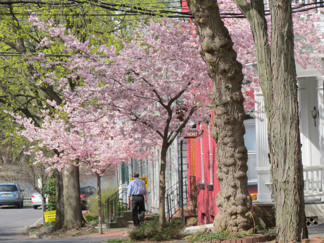 cherry blossoms are showing off again in the Stockade » Yu CHang strolls down Washington Ave. toawrd the Mohawk River among cherry blossoms – – Schenectady NY Stockade — 28Apr2013