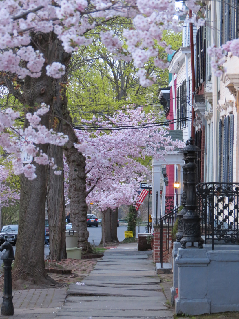 cherry blossoms are showing off again in the Stockade » a view near sunset north up Washington Ave. from 27 Washington Ave. – Schenectady NY Stockade — 28Apr2013