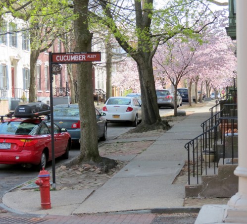 cherry blossoms are showing off again in the Stockade » looking south up the east side of Washington Ave. from Cucumber Alley – Schenectady NY Stockade – 28Apr2013