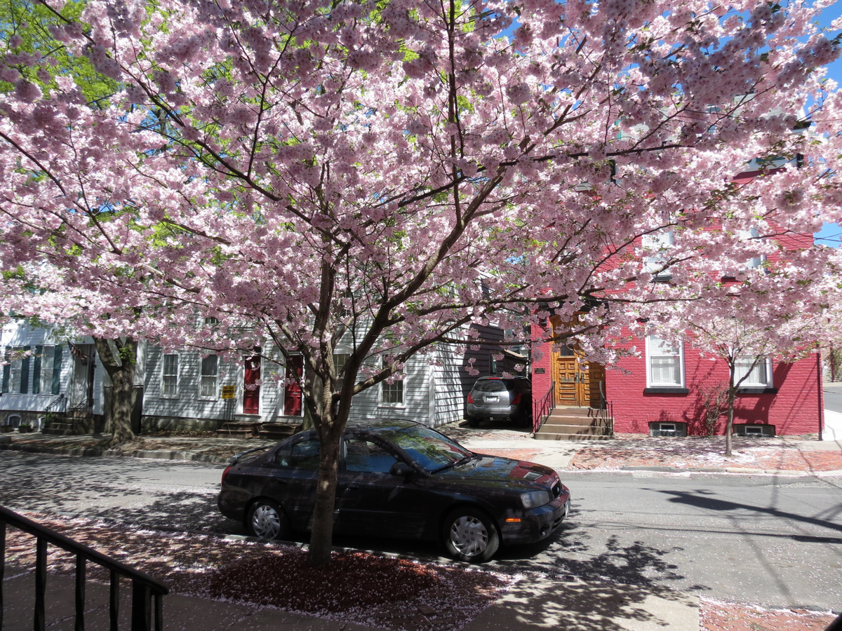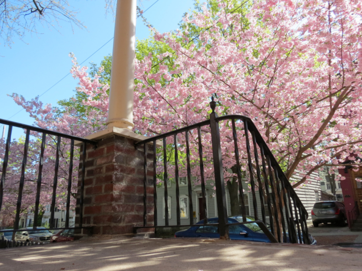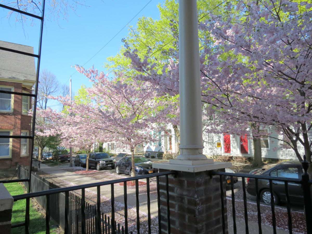– a 1910 porch rail and pillars at 16 Washington Avenue, cherry blossoms, too –
