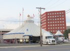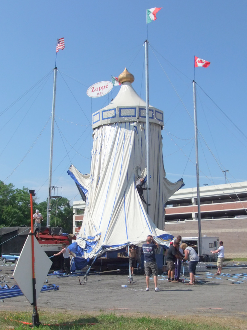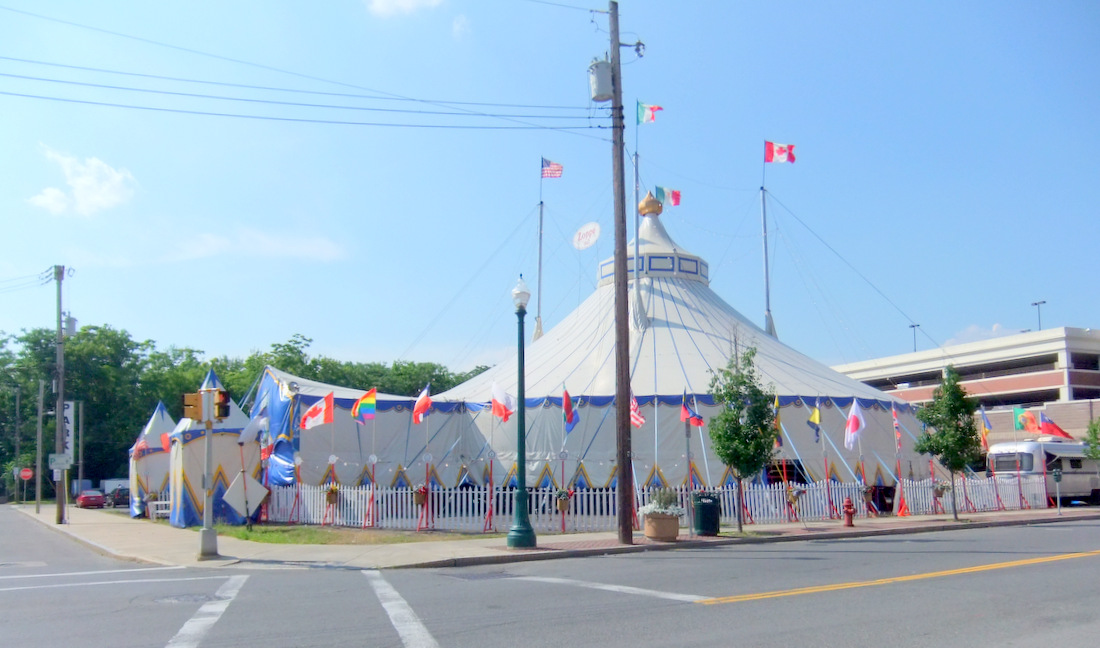 Heading up Broadway this afternoon (Tuesday, July 16) for some grocery shopping, I saw that the circus crew was in the process of putting up the Zoppé Family Circus tent in preparation for the 4-day Proctor’s stand that will begin Thursday, July 18. There will be 8 shows, from Thursday evening through Sunday afternoon. The circus is at the same location as last year, next to Villa Italia and the Municipal Parking Garage, at Broadway and Hamilton Street. You can get more information at Proctor’s Zoppé webpage. Last summer, I also stumbled across the newly-erected Zoppé tent, and posted quite a few photos.