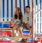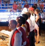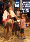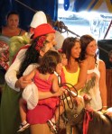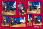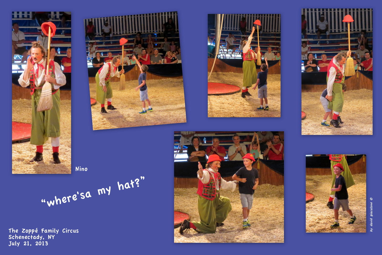 I put together four collages commemorating episodes from the show: Nino trying to find his red hat, with the help of a young audience member; three knife throwers showing their skills; photos of youngsters and families taken with the little horse Cavallino; and Nino trying to figure out just where Papino will allow him to play his trombone (“big trumpet”). Click on each of them for a larger version: