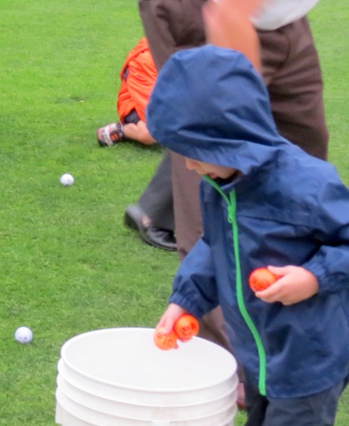 Nicholas puts golf balls in a bucket