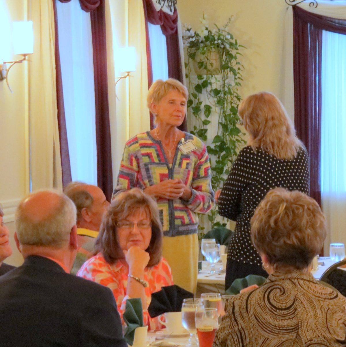 Pat Mett [standing, center] chats with Pam Menton [R]