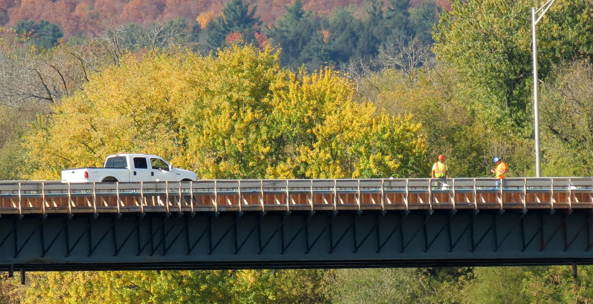 • (Dec. 13, 2013) No Good Reason for the Redesign to Leave Out the Guardrails: The lane from Schenectady to Scotia is still being constructed going well into December 2013.  When the plans for WGB were redesigned in September to include the steel railing that would preserve the eastern view, it should have been obvious and easy to also include a separator guardrail between the sidewalk and the roadway. Many members of the public asked for this safety measure, and our local leaders should have been making the argument that without guardrails those using the sidewalk would be in more danger than with the pre-rehab configuration of the Bridge.  Unfortunately, DOT seems to be arguing that the old guardrails were there to protect vehicles, by reducing the number or severity of collisions with the outer railing.  The protection of pedestrians and bicyclists was an unintended benefit of the guardrails, is their apparent argument, so that losing  that protection is not an important design issue for the project.  DOT made that argument earlier this year about a bridge in Troy. See the Times Union Advocate column for June 6, 2013..