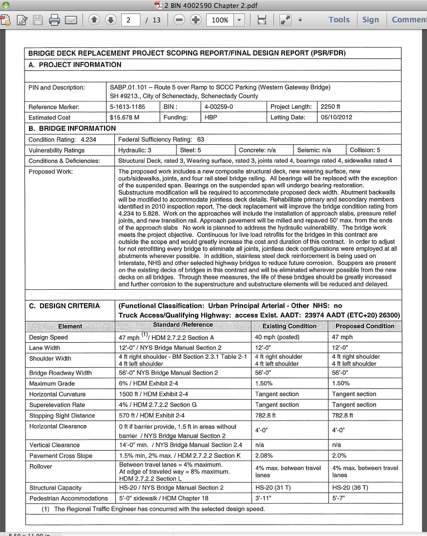 The required bridge section shall be 68’-6” feet fascia to fascia, 6” wider than the existing width.  The bridge section (looking towards Schenectady) shall consist of a 14” width for placement of the parapet, a 10’-2” sidewalk, a 5” granite curb, a 14’-0” shared use lane, two 11-0” travel lanes, a 14’-0” shared use lane, a 5” granite curb, a 5’-2” sidewalk and a 14” width for placement of the parapet.
