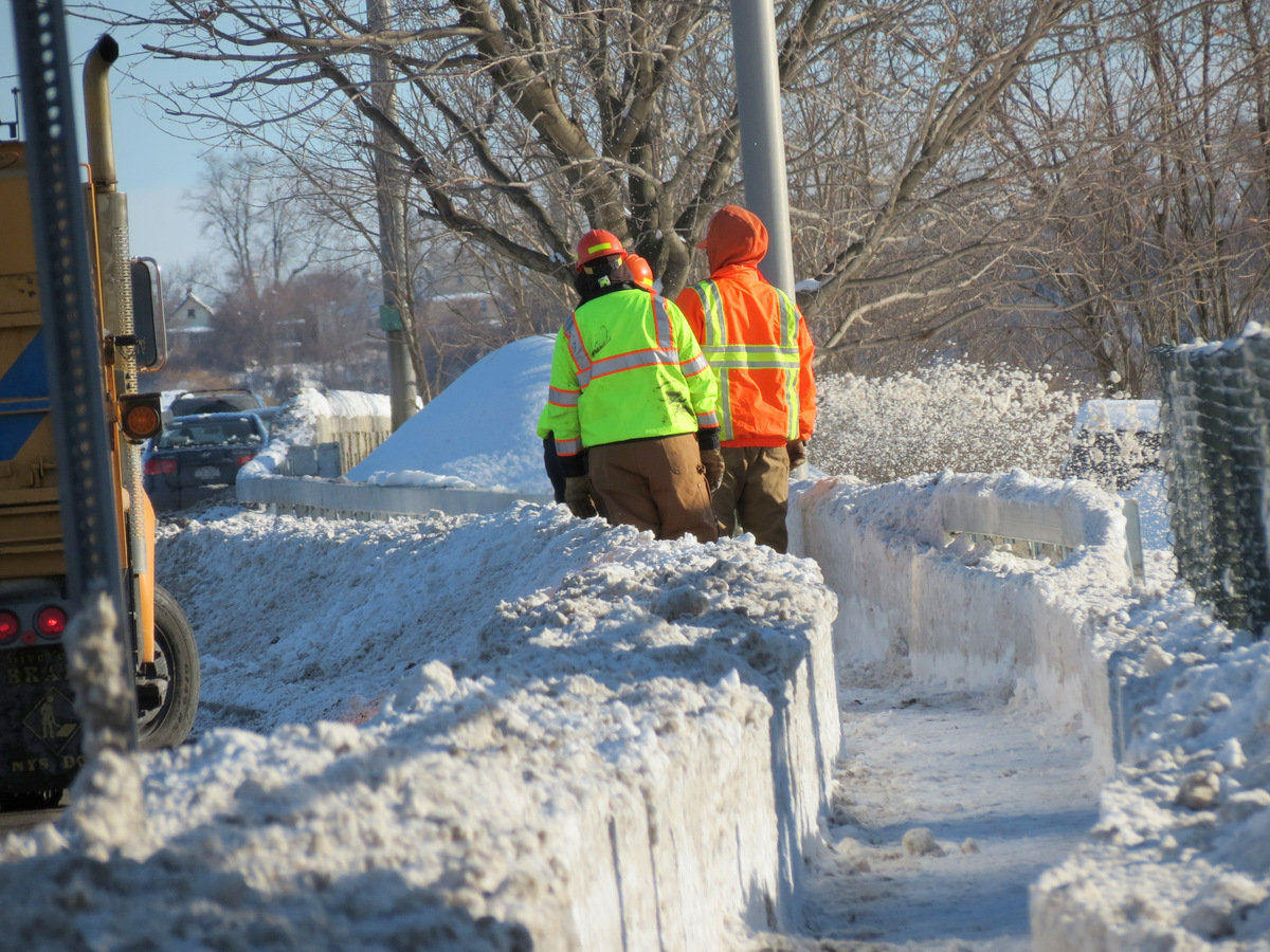 Things were even worse for pedestrians on the bridge on February 5 (see photo above), as there had been no plowing at all of either sidewalk at 2 PM, despite 10 to 12 inches of snow, forcing pedestrians to walk about half a mile in the slippery roadway in a strong wind, with very poor visibility.