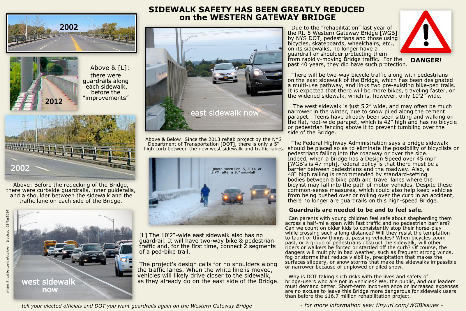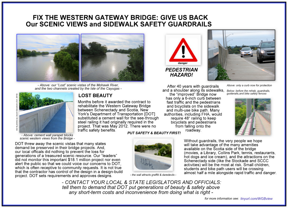WGB-FlierE. .  Editor’s Note: This posting has grown quite large, with many updates, as I learned more and more about the Western Gateway Bridge [“WGB”], the regulations and process at NYS Department of Transportation [“DOT”], and the actions and non-action of our local municipal leaders and planners.  At first, I focused solely on the beautiful view lost when steel railing was replaced by a cement parapet, but as I learned more about the threat posed by the barrier-less sidewalks, I came to believe the Sidewalk Safety Issue was just as important and surely more urgent.  Click on the collage image to the right of this Note for a larger version of a 1-page flier summarizing the Lost View & Sidewalk Safety issues at the Western Gateway Bridge, over the Mohawk River, NY Rte. 5, between Schenectady and Scotia NY.