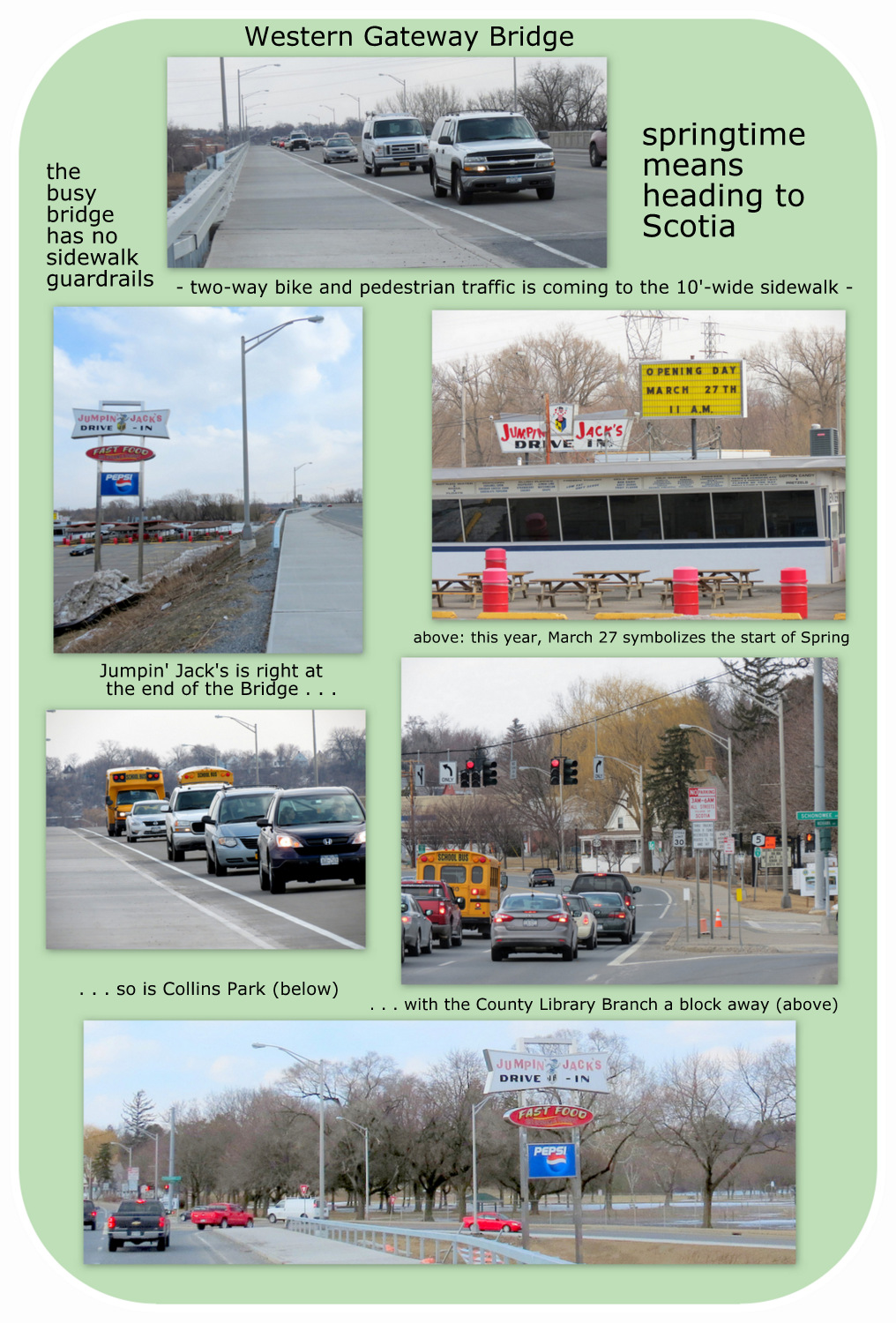 (March 26, 2014): Jumpin’ Jack’s opens tomorrow, and for many it means Spring is here, a time to head from Schenectady to Scotia on foot or bicycle, making the problem of dangerous sidewalks on WGB far more urgent. Click here, or on the collage immediately below to see how close the Bridge is to some of the amenities that bring families, couples, groups of kids, and singletons of all ages to that part of Scotia.  For example: Jumpin’ Jack’s and Collins Park are directly at the end of the Bridge; the Scotia branch of the County Library is one block away, and downtown Scotia two blocks away.