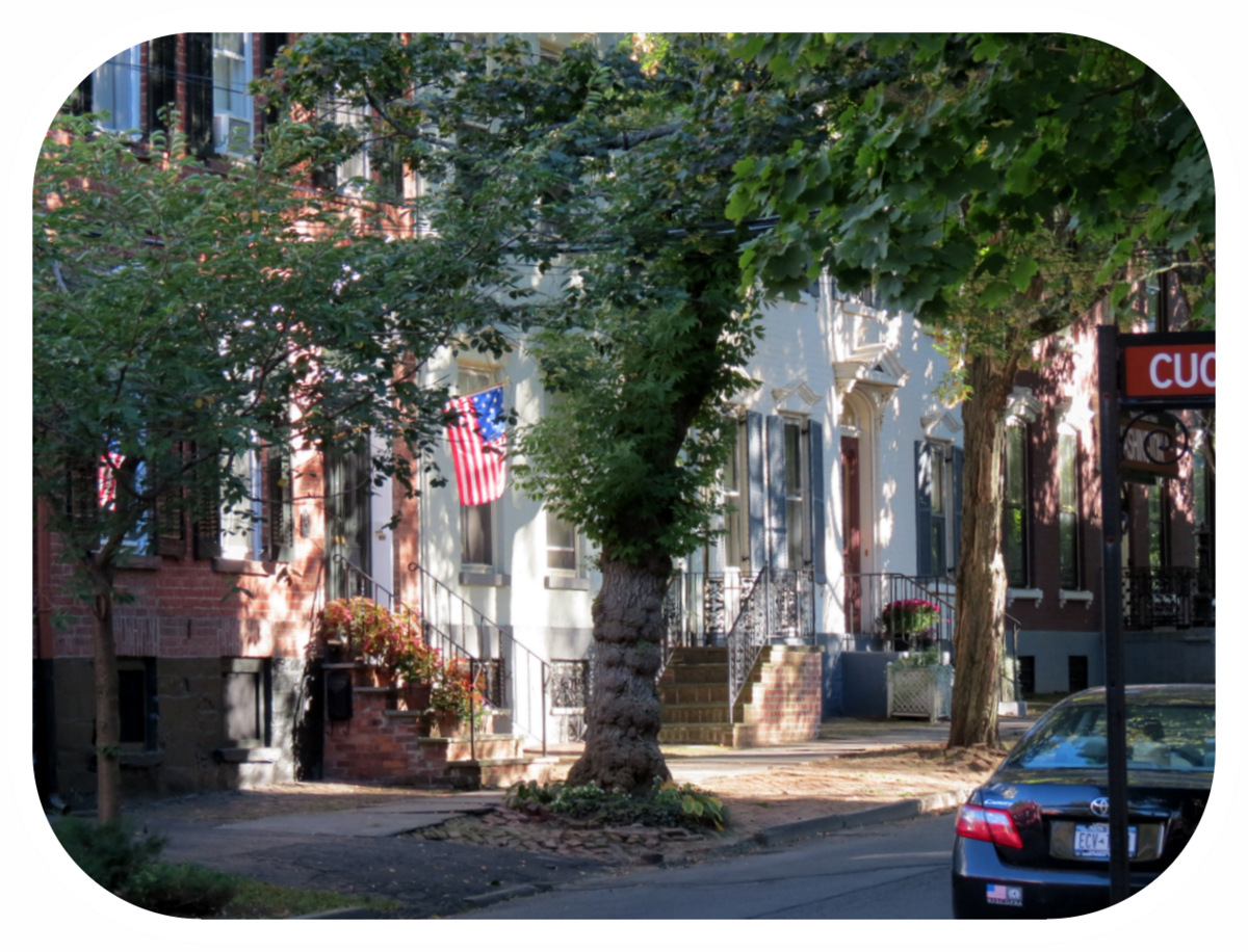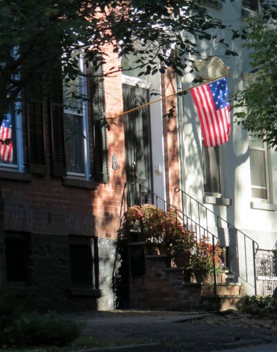 One of my favorites scenes in the Stockade starts just a few yards from my front door: the play of light and shadows before sunset on the front of Washington Avenue homes, on the east side of the block (from No. 17 to No. 27), between Front and Union Streets, catercorner from the entry of Cucumber Alley. The core of the row of homes is called Campbell Row. It is across from the County Historical Society. I can see it from my front stoop, but I also come at that wonderful stretch of colors and beautiful homes from the other (Union Street) end of the block, and I bet (and hope) there are many others who enjoy the sight on their way home from work or on a stroll after dinner
