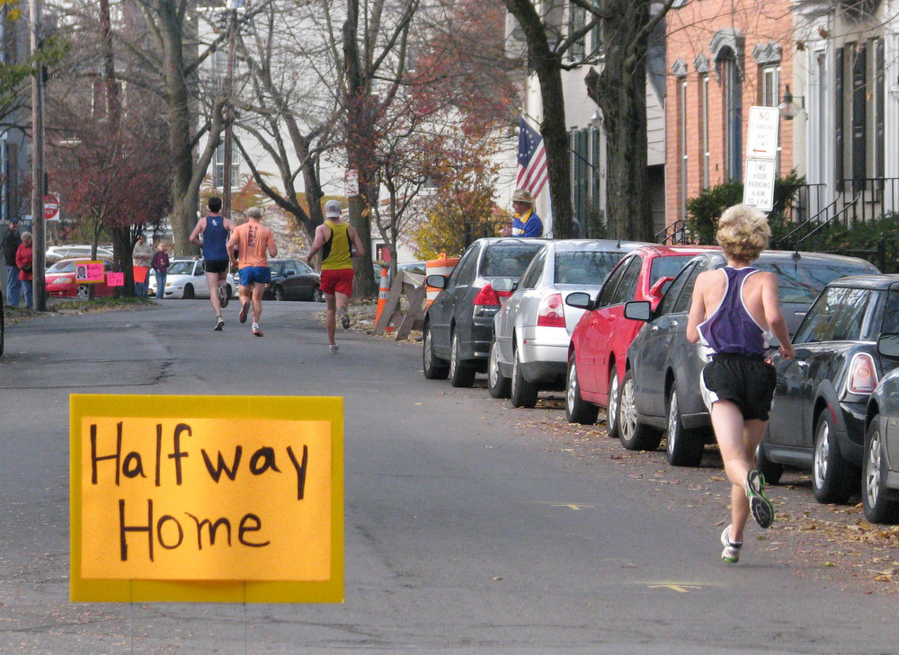 There are lots of places in Schenectady to fill up with pasta tonight. Tomorrow, as always, you can expected a warm welcome and hardy encouragement-cum-admiration along the streets of the Stockade neighborhood, with cheering fans, flags, ringing bells, and signs this morning. Lawrence the Indian’s Circle is the heart of the neighborhood and approximately the halfway point of the race and attracts many spectators. If the sun is out, you’ll be bathed in its warm glow as you enter the Circle.