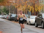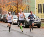 - Katie O’Regan [BIB 23], who finished 3rd in the Women’s Division, runs up Front St. along with runners Jake Stookey [BIB 1731, placed 26], Aaron Knobloch [BIB 957, placed 29], and Pat Cullen [BIB 415]
