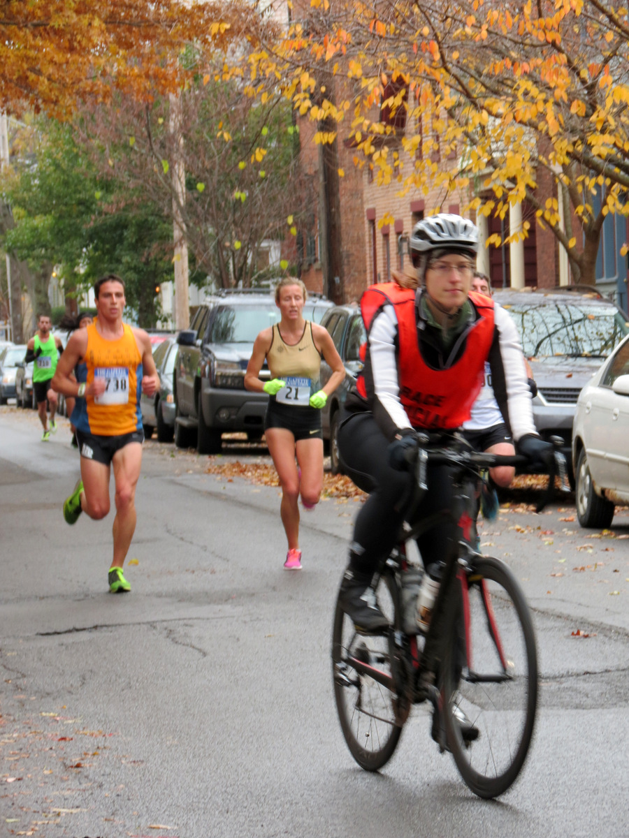 Race Official (on bike) leads Hanna Davidson and Owen Strong