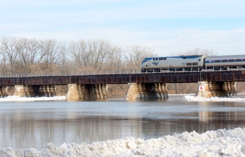 an Amtrak train crosses the CSX trestle heading from Schenectady to Scotia