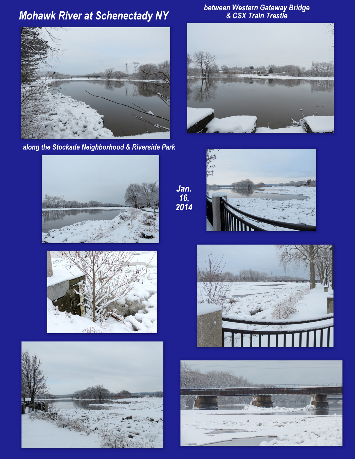 An article in today’s Schenectady Gazette about backed-up ice from North St. in the Stockade to Rexford, tells us that “The sun glistening on the ice-packed river was a stunning sight.” (“Residents along riverfront keep wary eye on ice,” by Kathleen Moore, B1, Jan. 16, 2014, posted online Wed. morning, Jan. 15). Unfortunately, the article comes with only one photo, and it was taken at Freeman’s Bridge. Kathleen was definitely right about the beauty on the River, and I think you’ll agree after viewing our Slideshow below, which naturally focused on the Stockade portion of the Mohawk River. [Click on the free-standing (outside the Slideshow) photos for larger versions, which help demonstrate the beauty.] There’s much more ice-jam beauty in our posting from Monday January 13.