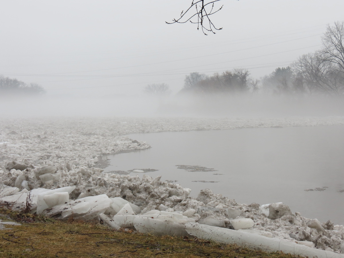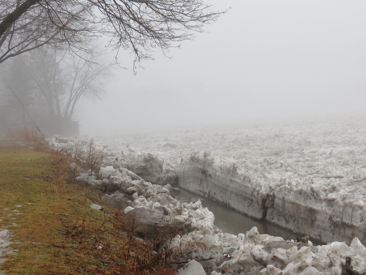 Finally, one more mystery (at least for me of limited scientific expertise): How did the “ice ditch”, with perfectly perpendicular sides get formed alongside the shoreline, near Governor’s Lane? Despite the fog, I’m certainly no machinery was secretly used to carve the formation. Mark Fisher helpfully suggested that the Binnekill, which empties in the Mohawk closeby (between Cucumber Alley and Gateway Landing), has its own current, running at a different speed and depth than the Mohawk. That difference might have brought about the separation from the mass of ice. I’ve often wondered why there would so often be unfrozen water near the shoreline behind Washington Ave. and Cucumber Alley, and around the old Burr Abutment. The Binnekill current — which was surely bursting with snow and ice-melt — might indeed be the answer. Please feel free to comment. The following collage shows pictures related to the “ice ditch” issue.