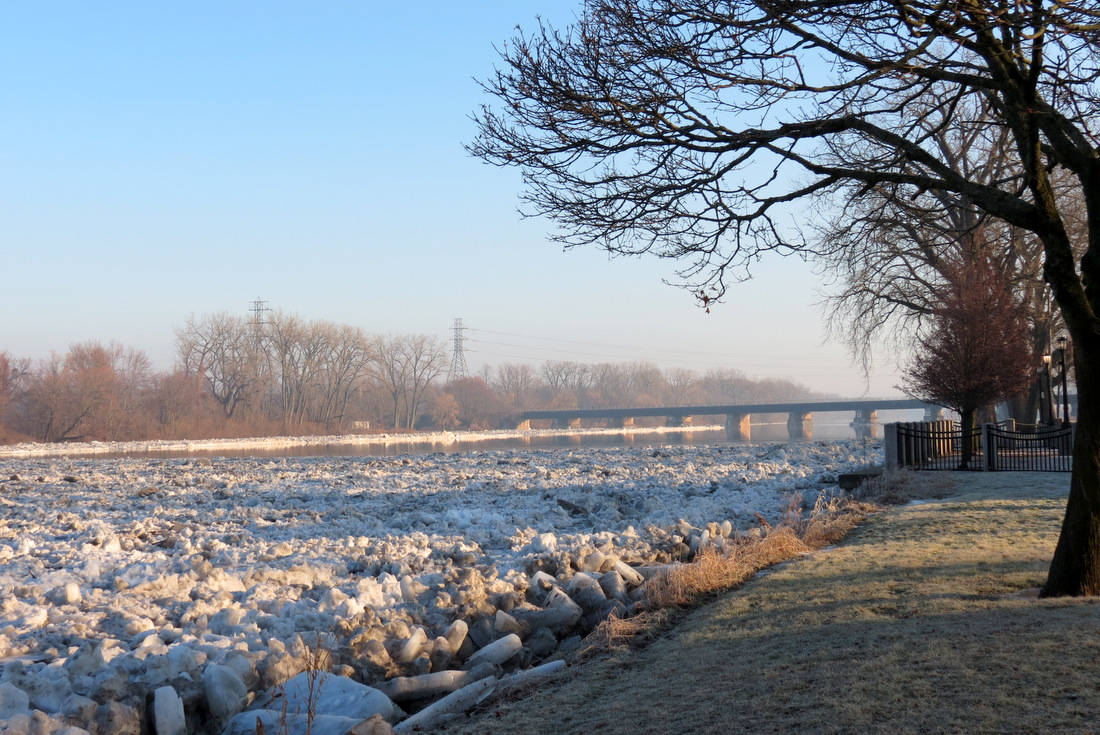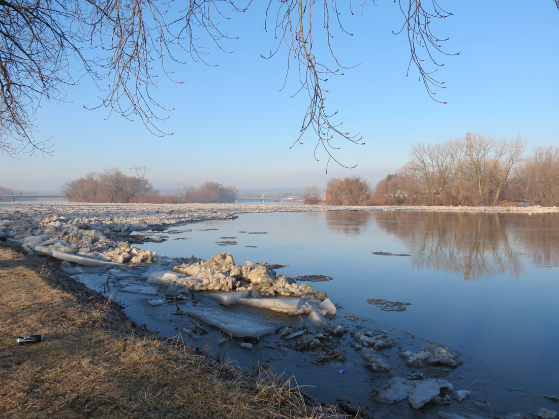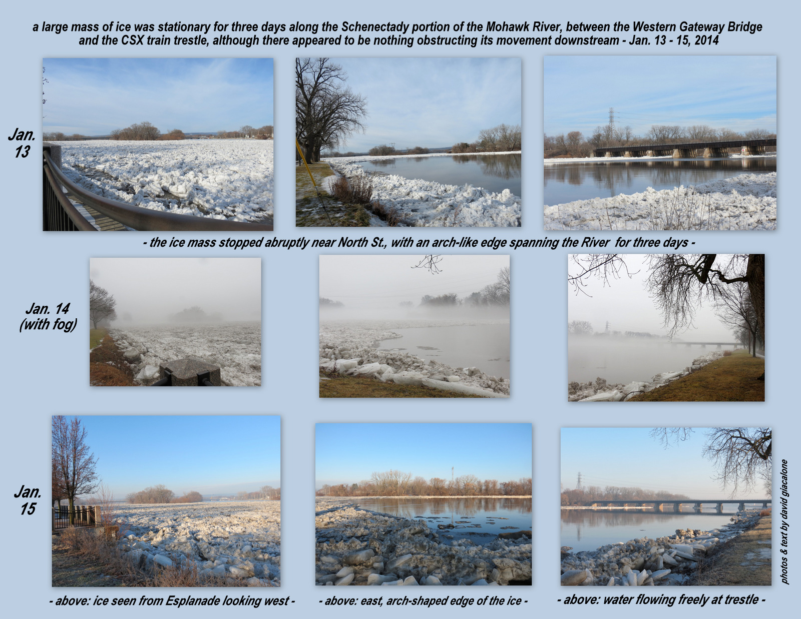 – above: For three days (Jan. 13, 14, 15), a mass of ice was “stuck” between North St. and the Western Gateway Bridge (and perhaps as far upstream as Rexford), although there appeared to be nothing but clear, flowing water for its trip downstream. Even the often-culpable piers of the CSX trestle were clear. The downstream edge of the ice mass was in the shape of an arch and spanned both banks of the River.