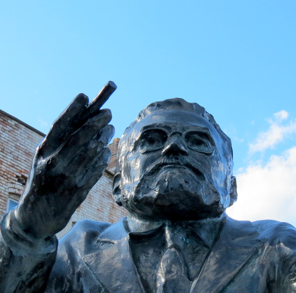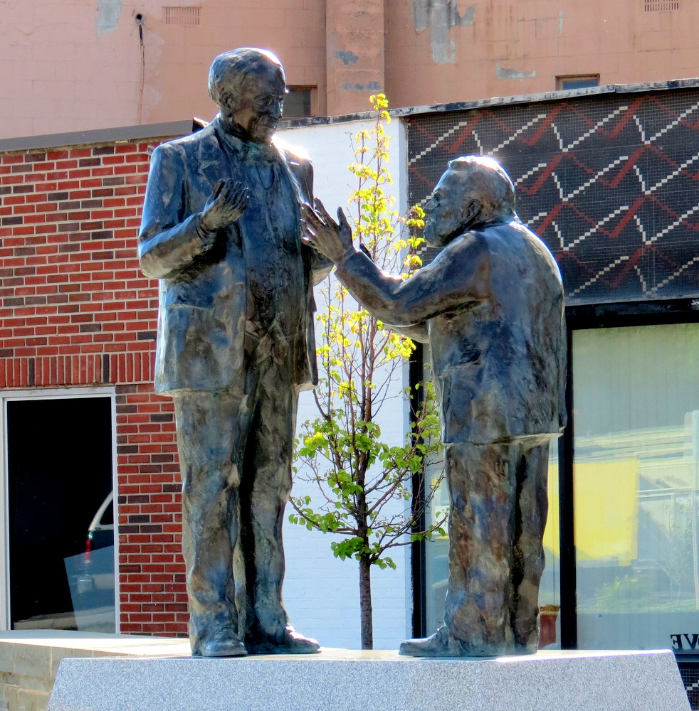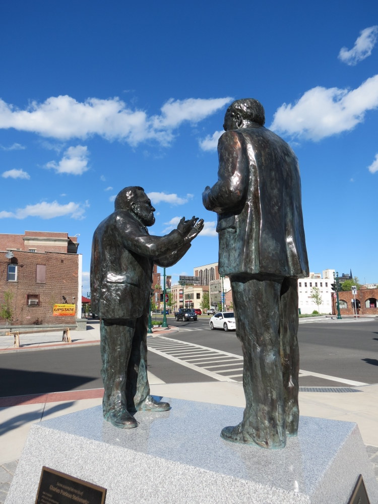 Statues of Thomas Alva Edison and Charles Proteus Steinmetz were unveiled this morning on a single pedestal, in a pocket park at the corner of Erie Boulevard and South Ferry Street, a few blocks from the main SchenectadyGeneral Electric plant.  The pair, who laid the foundation for the global giant GE, were inventors and close friends, and are often called the “Fathers of Electricity”.  The plaques on each side of the pedestal tell about the two men and their accomplishments.