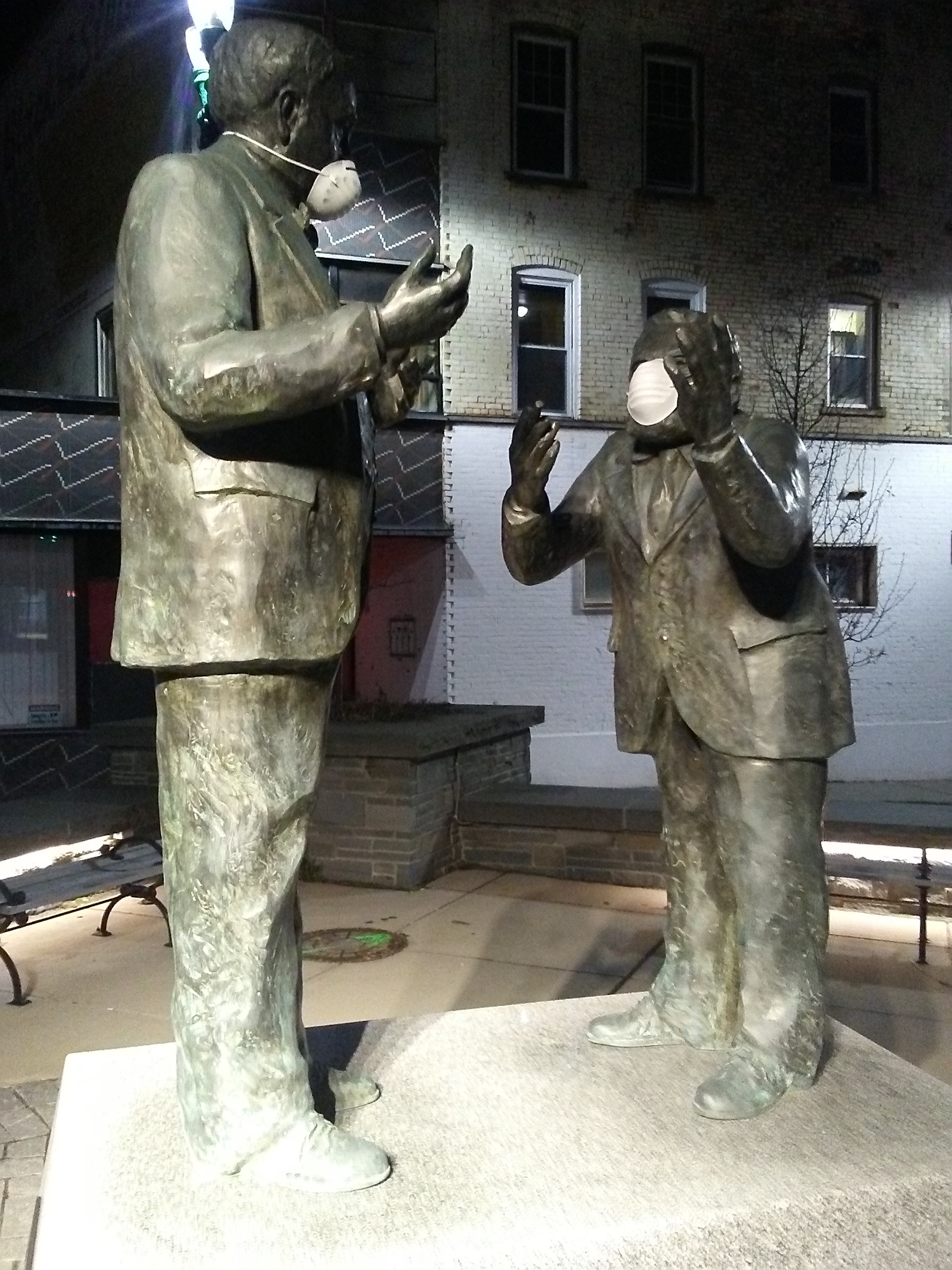 edison-steinmetz-night-fwicks follow-up (March 26, 2020) See “Amid coronavirus response someone gives Edison and Steinmetz statues in Schenectady masks“, by Bill Buell, March 25, 2020). Photo to the left courtesy of Dr. Frank Wicks.