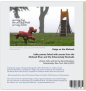 The hardcover book Haiga on the Mohawk is 8″ x 8″, and has 37 photo-haiga (explained below), with photos and haiku poems by David Giacalone, the photographer at suns along the Mohawk, whose haiku have been published in many of the best haiku journals. In addition, four of the poems in Haiga on the Mohawk were written by the distinguished members of the Route Nine Haiku Group.