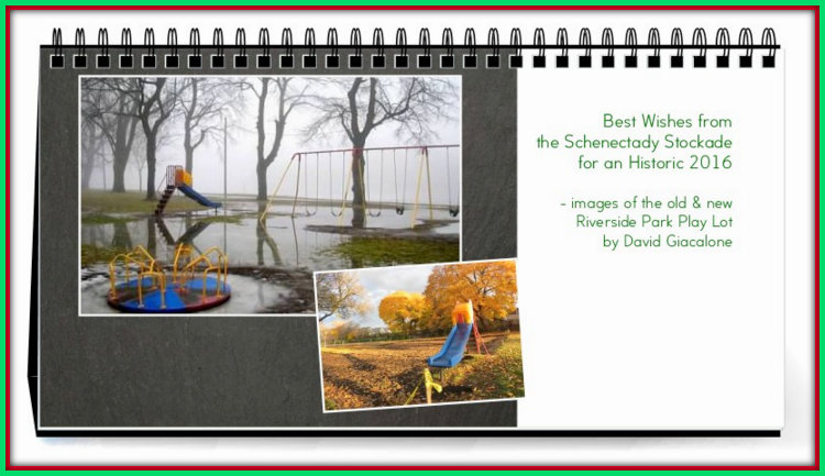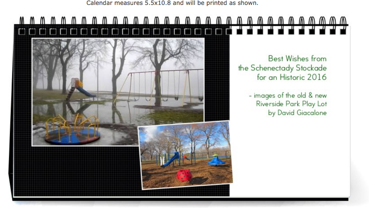 Price: $16. The 2016 Play Lot desk calendar is 5.5 x 10.8 inches, and has a built-in easel for display. Each month features one or more photos of the new and old versions of Schenectady’s Riverside Park playground area, along the Mohawk River. The Play Lot received a make-over in early November 2015, with only the Slide remaining from the “Old” configuration. The Play Lot Calendar is meant as a memento of the beloved Old Play Lot (see our “already nostalgic” posting), and a preview of the New. Its cover is shown in the image at the head of this paragraph (click on it for a larger version).