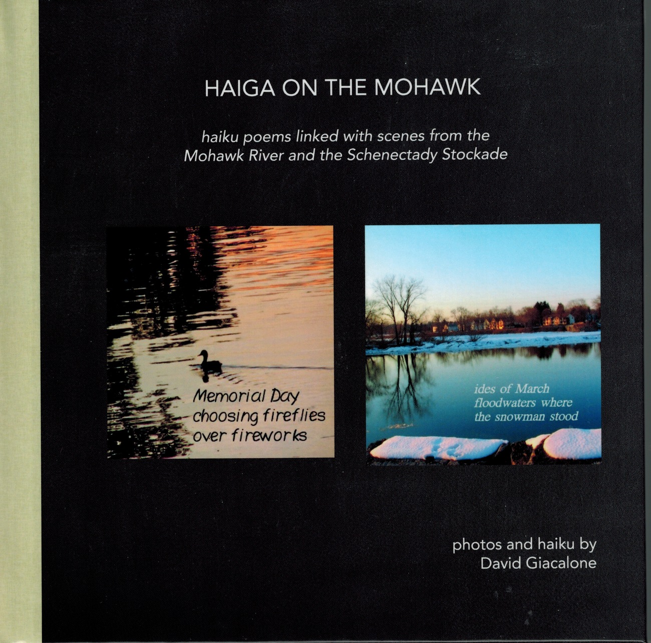 Price: $20. The 24-page photo-book “Haiga on the Mohawk” has scenes from the Mohawk River and Schenectady Stockade combined with short, haiku-like poems. The book was created in the Fall of 2015 to celebrate Haiku North America 2015, a Conference presented at Union College, from October 14-18. HNA 2015 attracted about 130 of the very best English-language haiku poets, publishers and educators from over a dozen countries to Schenectady. The Conference was an opportunity for the proprietor of this website (David Giacalone) to introduce the attendees to the Stockade, the Mohawk River, and Riverside Park. The book is a relatively painless opportunity to introduce lovers of the Stockade and Riverside Park to modern English-language haiku poetry (see a definition at the foot of this page*) and “photo-haiga” (explained below).