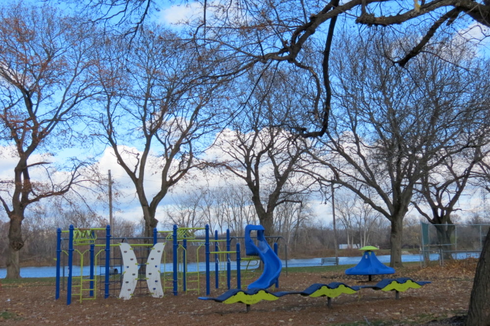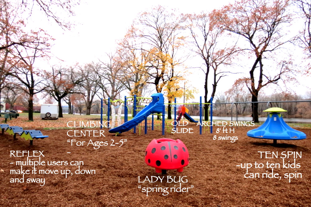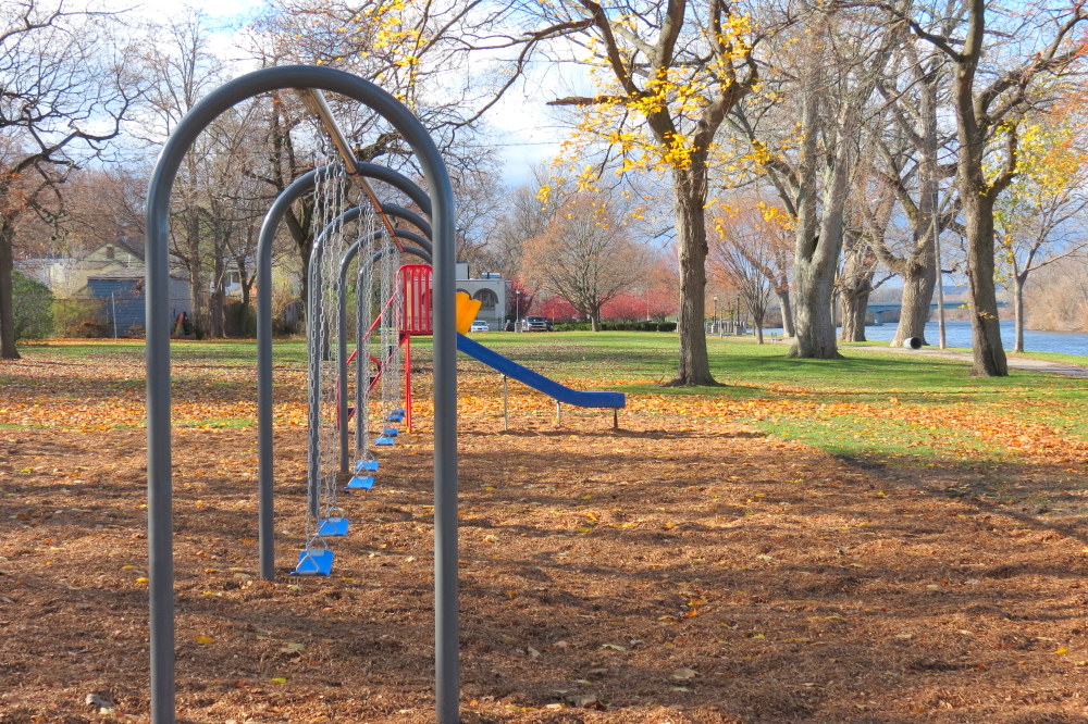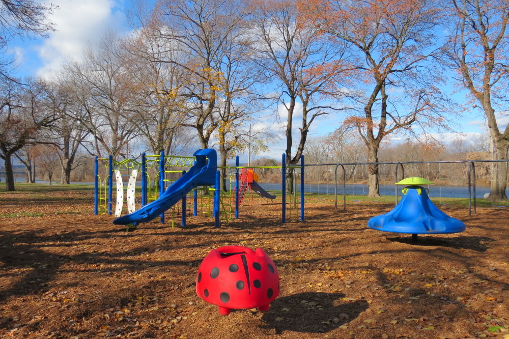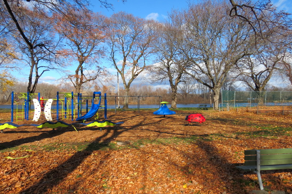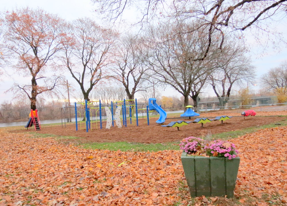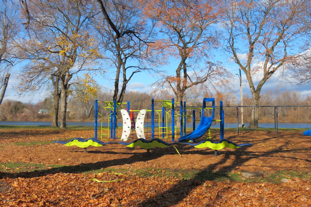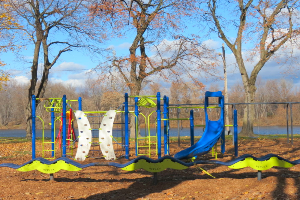 As of Wednesday, November 11, 2015, the mulch was spread and the yellow “keep out” tape taken down, making the new Riverside Park play lot “open for business” and play. The Slideshow below contains photos taken on November 11 under a gray sky and on November 13 under a very blue sky.