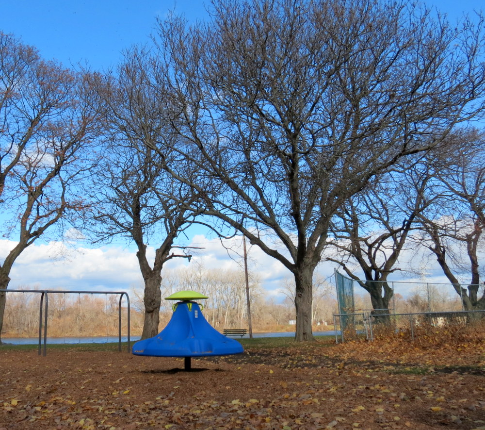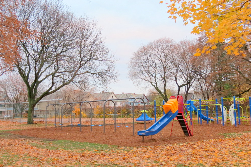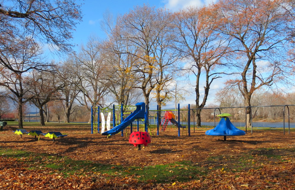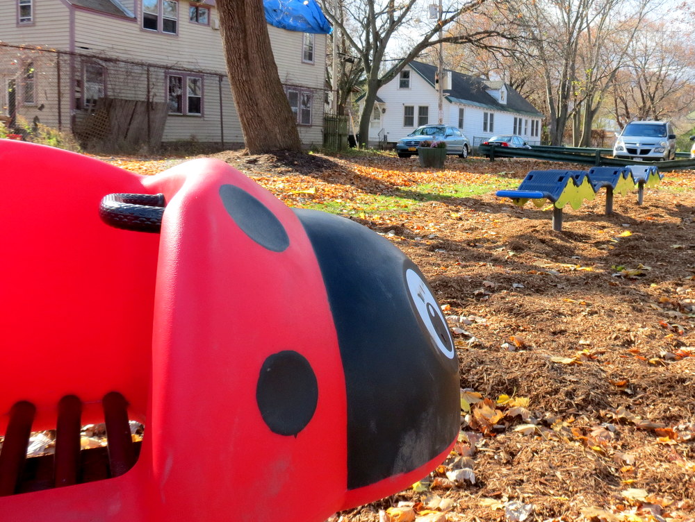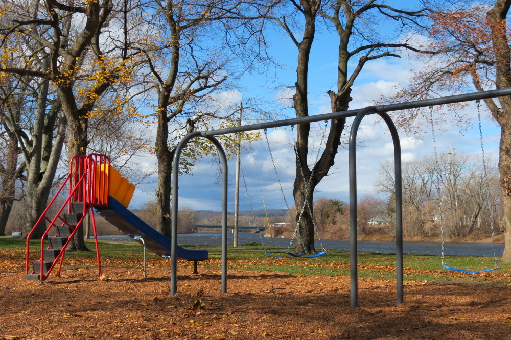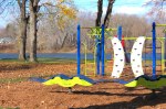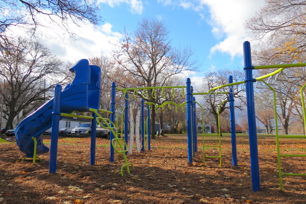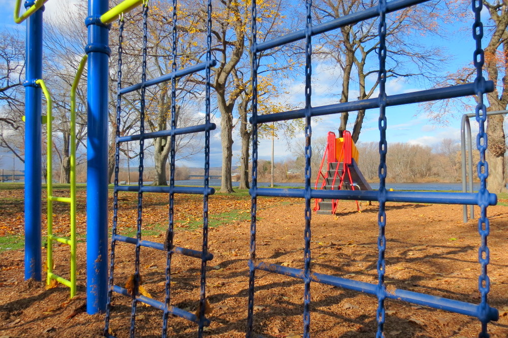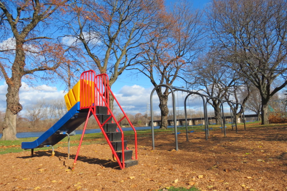 As of Wednesday, November 11, 2015, the mulch was spread and the yellow “keep out” tape taken down, making the new Riverside Park play lot “open for business” and play. The Slideshow below contains photos taken on November 11 under a gray sky and on November 13 under a very blue sky.
