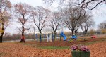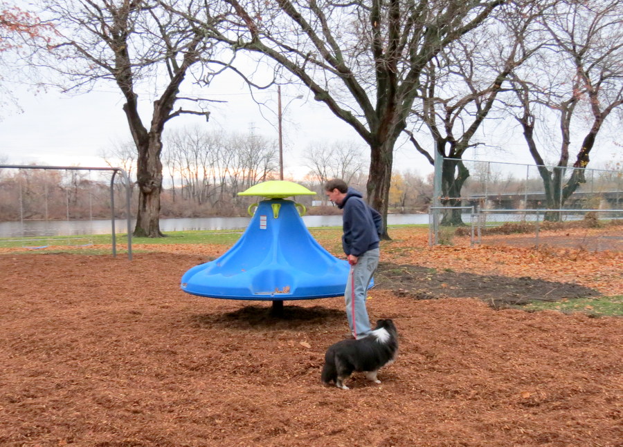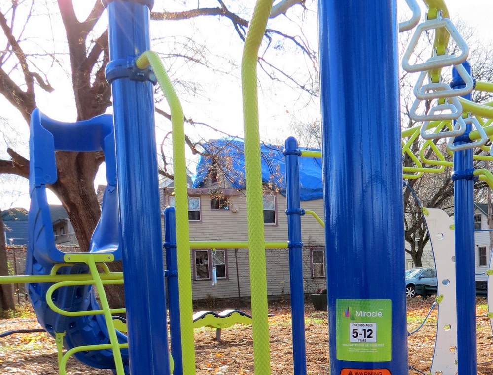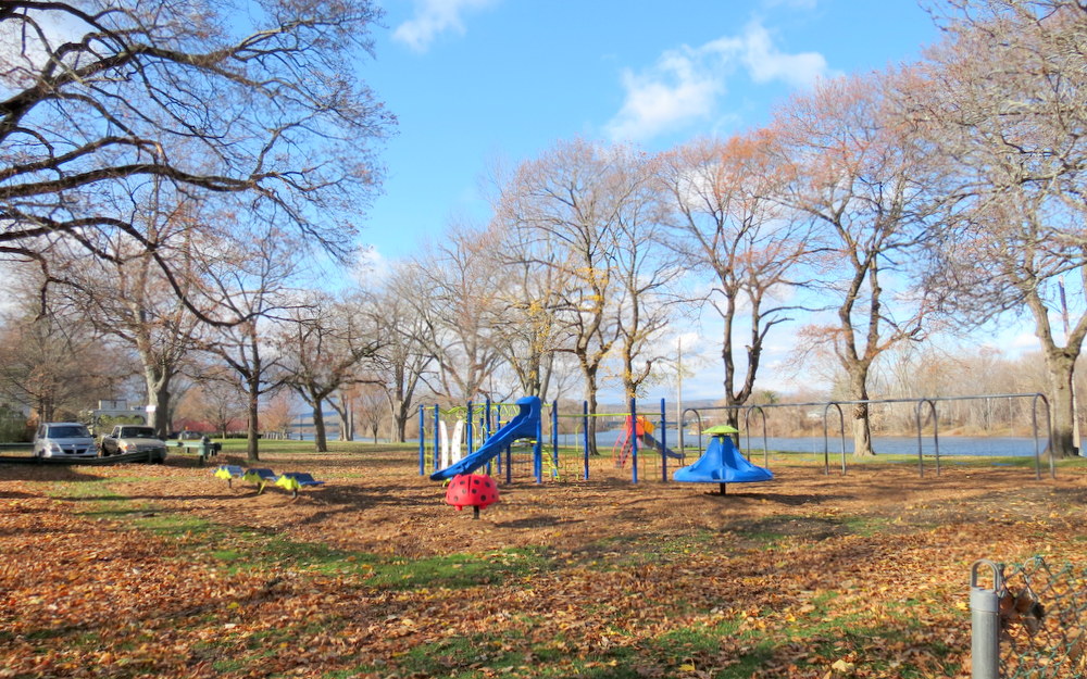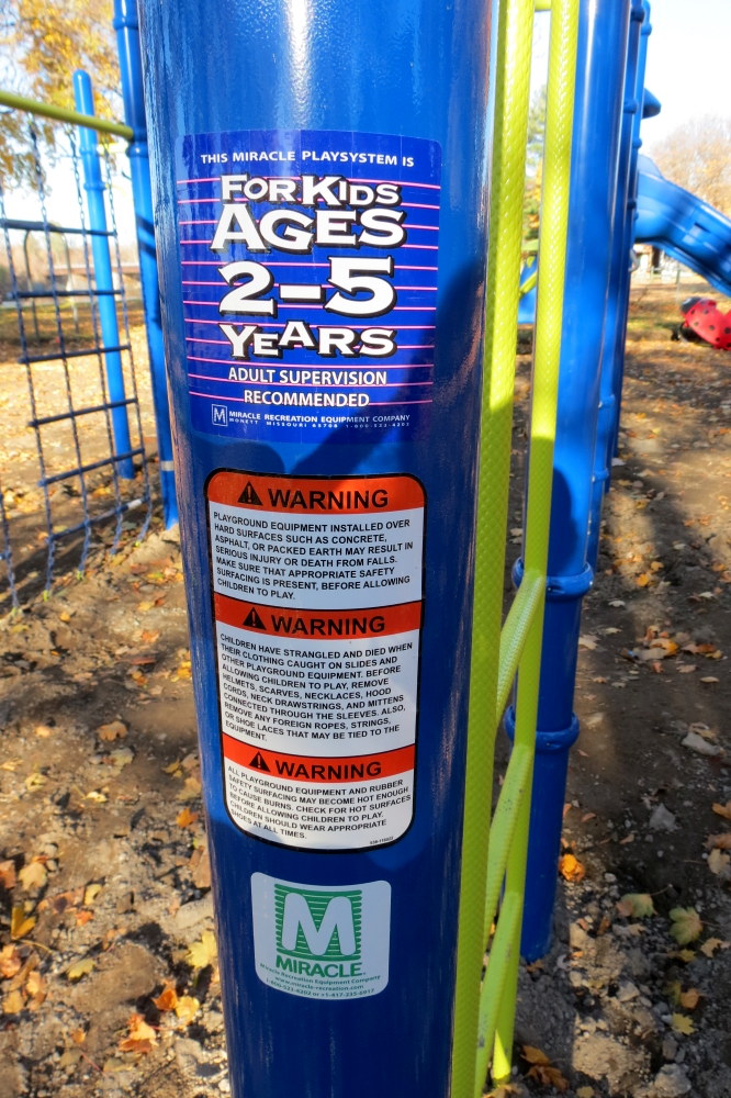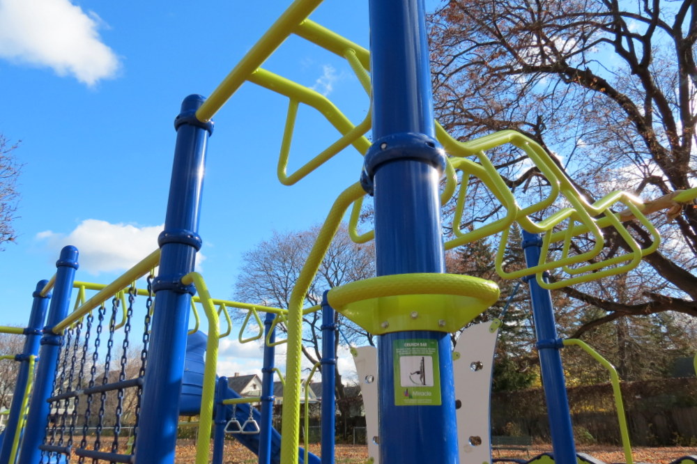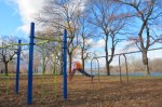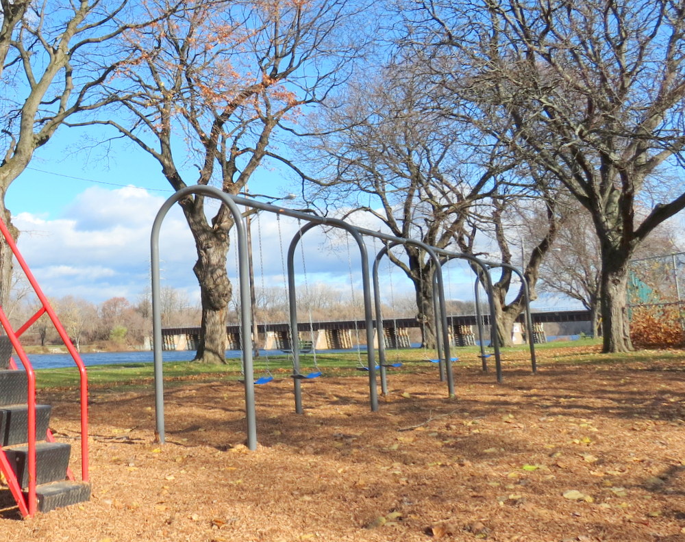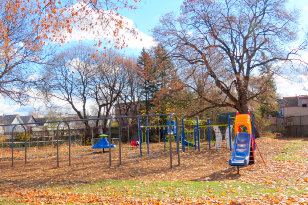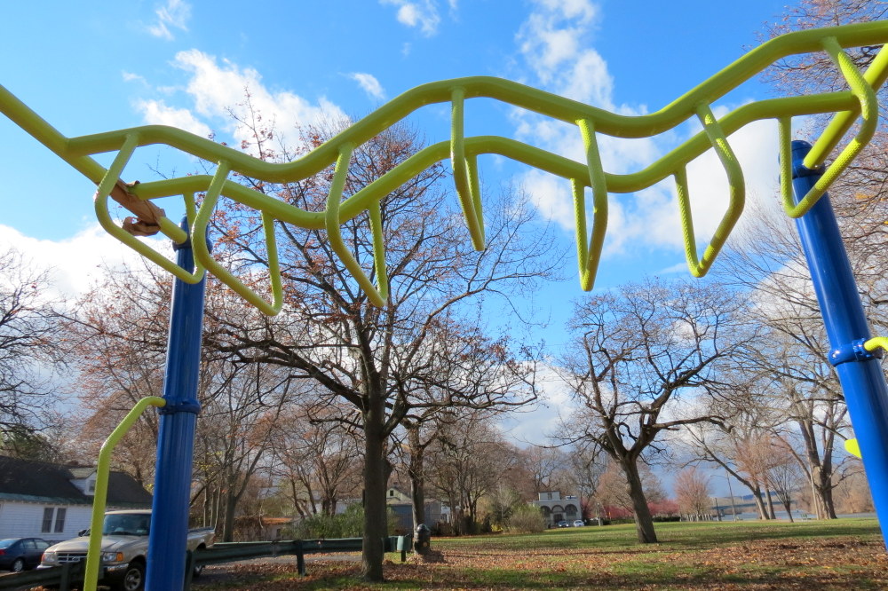 As of Wednesday, November 11, 2015, the mulch was spread and the yellow “keep out” tape taken down, making the new Riverside Park play lot “open for business” and play. The Slideshow below contains photos taken on November 11 under a gray sky and on November 13 under a very blue sky.