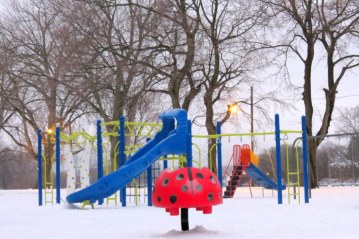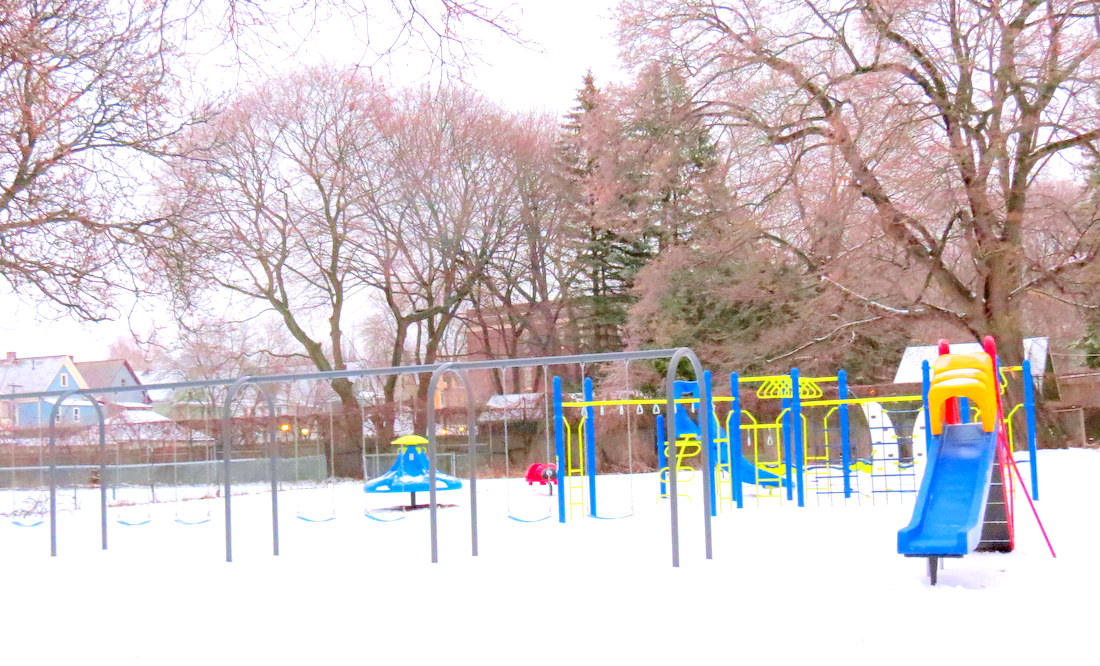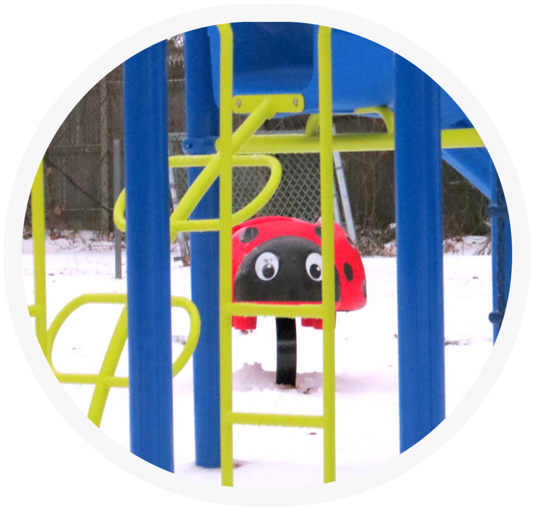 Thanks to a gentle reminder on Tuesday from Schenectady Corporation Counsel Carl Falotico (who should not be confused with the good luck Lady Bug to the left), I captured the first snowfall of the year the day it happened (Dec. 29, 2015), at our new Riverside Park play lot. Carl recalled that I had wondered aloud if the new play lot would be as charming as the configuration we had come to know and love. Although there really wasn’t enough snow for a truly fair comparison, I will admit that I am still “nostalgic for the Old Play Lot” (click on the nostalgia link to see why; and see our FCSS fundraising 2016 Play Lot Calendar, which has monthly photos of the old and new versions).