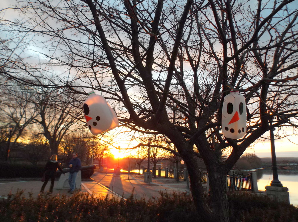 If a Canadian and Indian delegation had arrived at the Stockade yesterday (Saturday, February 6, 2016), for the first-ever event Celebrate the Snowman – Commemorating the 1690 Massacre – they would have found no snow (and no gate), and a somewhat miraculous, tiny “real” snowman near North Ferry Street on Union Street [see L]. If they headed past Lawrence the Indian, to the Mohawk River, they would have encountered a small “party” of hardy Stockadians alongside the silent Riverside Park canon, with their ragtag army of artificial snowmen. Although nature provided no snow, it did offer a beautiful glow from the setting sun. [See the Slideshow below.] The 2016 militia was led by Carol DeLaMater, Susan DuFour, and Susan Brink. Where they imbibed after their parkside event is unknown.
