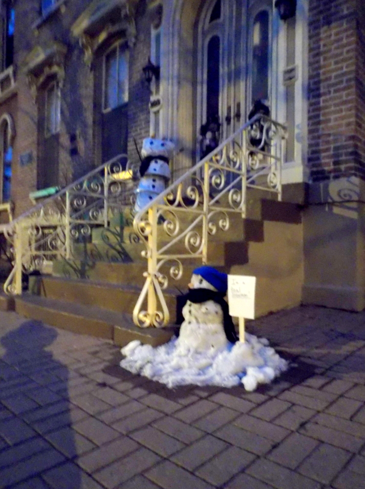 [L] This sentinel snowman carries on the great Stockade-Tavern-Tradition, losing his head and forgetting to guard the gates. (Thanks to C. Gelarden for the photo)