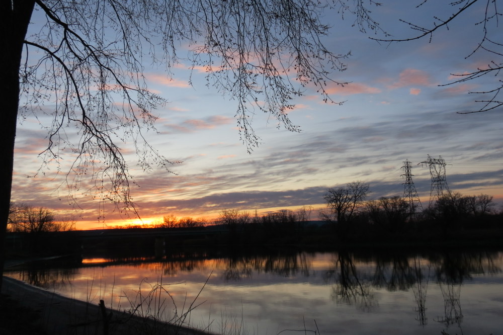 Why would anyone drive to find a sunset waterfront vista, when there’s one at his backyard? Beats me. I enjoyed a lazy sunset photoshoot yesterday evening, March 26, the day before Easter 2016, along the Mohawk riverbank at Cucumber Alley here in the Schenectady Stockade. Although I didn’t see the Easter Bunny hiding eggs, I did spy dinosauruscucumbus lumbering across the yard, with plenty of capacity for lugging vast quantities of chocolate. The purple and orange shades of sunset filled the sky and reflected on the River. And, two young men were enjoying the tranquil scene from the riparian strand that has been carved at the once lushly foliated backyard of 1 Cucumber Alley.