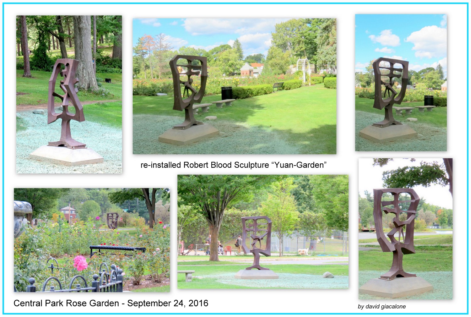 On August 21st, we wrote of changes at the Central Park Rose Garden, in preparation for construction of a pergola in the Garden this Fall. A major change was removal of Robert Blood’s sculpture Variations on the Chinese Character “Yuan”, to make room for the pergola, with a promise that The Yuan would return. I am pleased to say that Yuan Is Back, reinstalled in a far front corner, close to the Crime Victims section, near the roundabout at Iroquois Way and Monument Hill, and across from the Dog Park.