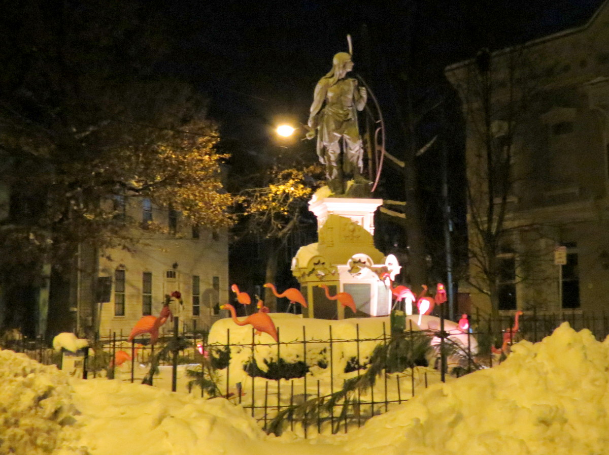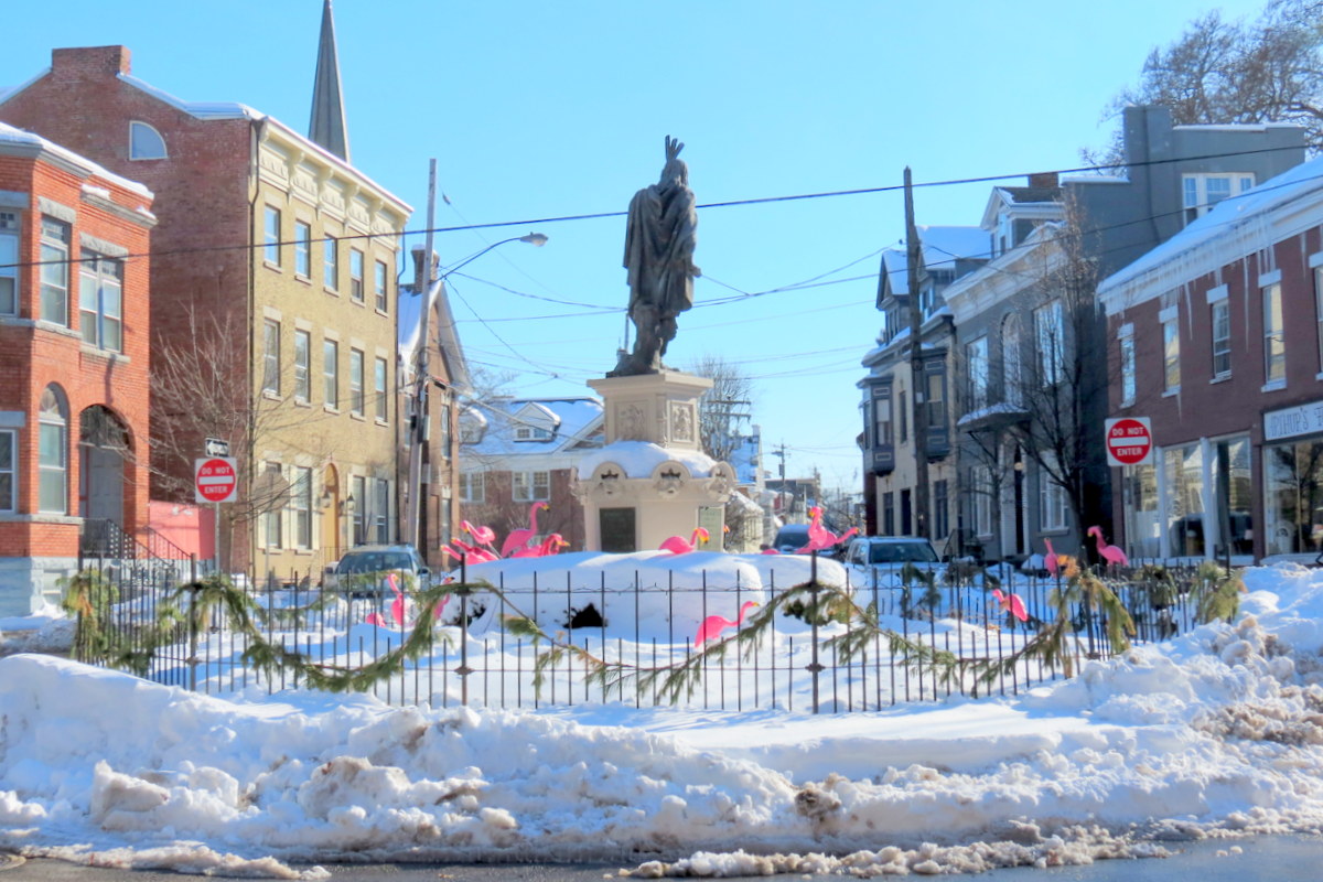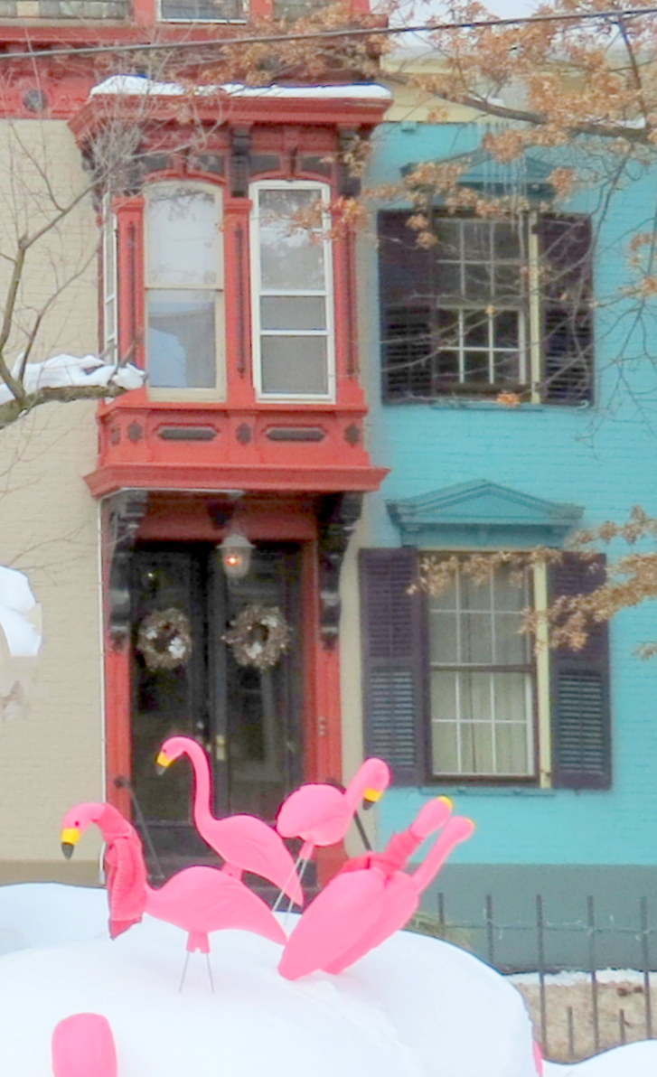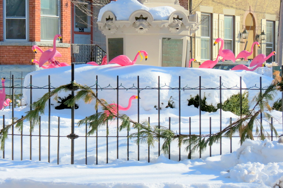 Once we have some Valentine Day daylight, and maybe even a bit of blue sky, our editor will get his old Canon back to Lawrence Circle, and post a flock of photos. If you need a Flamingo Fix before then, see the links on our Valentine Flamingo Category page, or view the 20-page photobook “Valentine Flamingos in the Schenectady Stockade: whimsy and mystery at Lawrence Circle” (3rd Edition, 2016; contact us to obtain a copy for our price to print it).