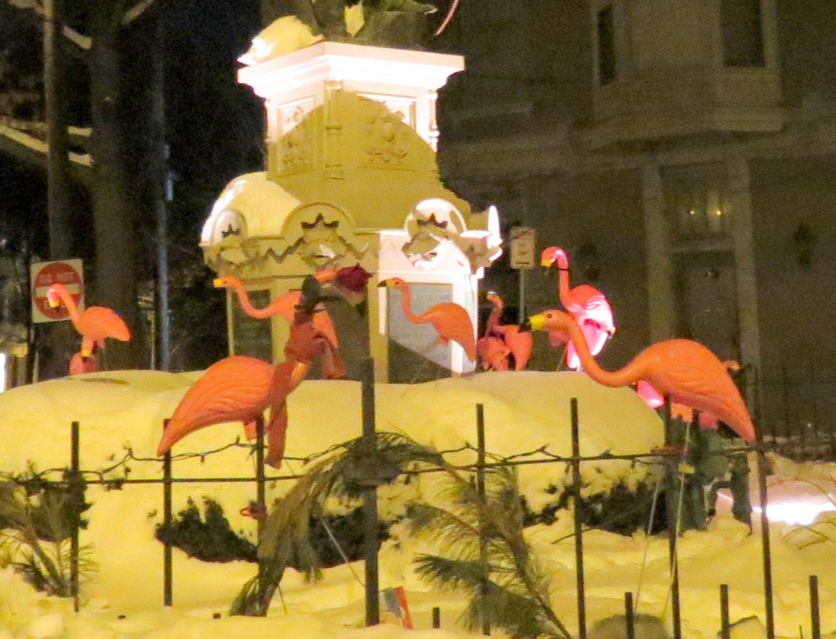 update (5 PM): This slideshow has about twenty images taken under blue skies mid-afternoon today. Flamingos and Lawrence Circle from lots of angles. Don’t forget, you can see (and download, if you’d like) a larger version of any photo by pausing the slideshow on the photo, right-clicking, and choosing “open image in a new tab/window”.
