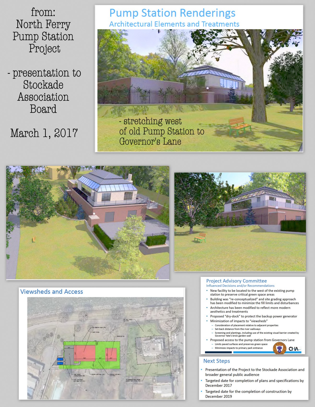 I hope there will soon be a full, objective discussion of the Proposed Plan and alternatives to it (e.g. reuse the old pump house and its present lot, or a different location outside of the Park, perhaps out of the floodplain), and I hope it will be led by an energized and responsible Stockade Association. To the right is a thumbnail image of a collage with salient portions of the March 1, 2017 presentation; click on it for a larger version, and feel free to download it or the Project pdf. file for distribution.