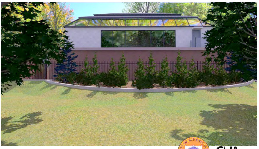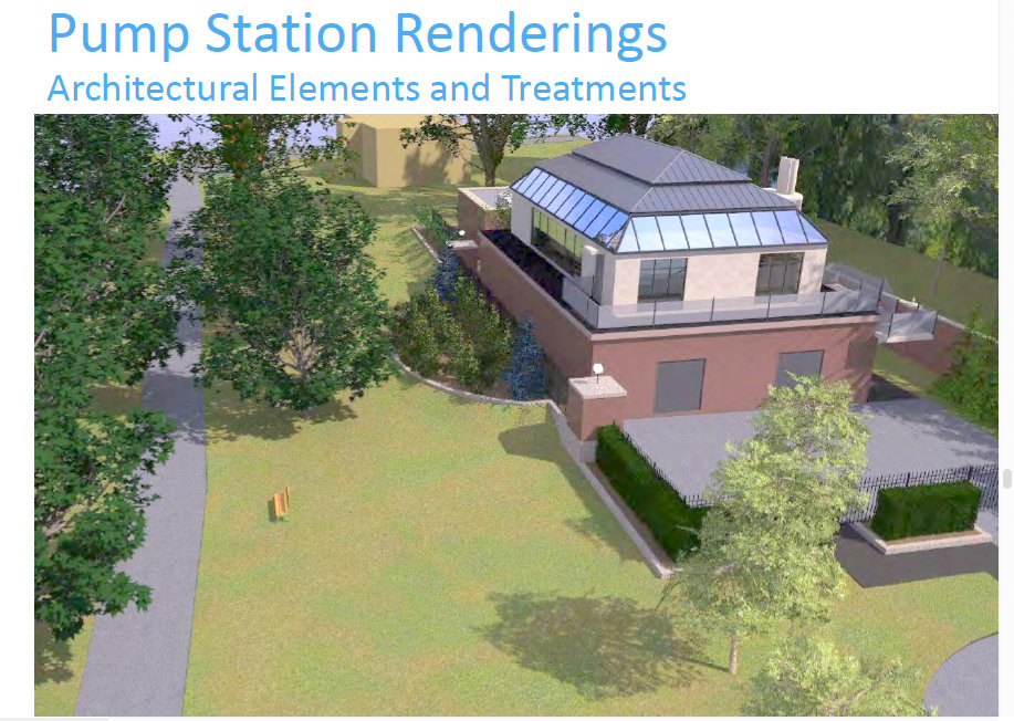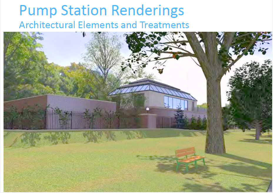 Have we been taking the quiet beauty of the great West Lawn of Riverside Park for granted? I’ve recently heard it said that “no one uses that part of the Park” — the section between the old Pump House and Governor’s Lane. The statement was apparently being used to justify usurping most of the space, viewshed, and charm of the West Lawn for a giant new sewage pump station, modern and industrial in style, that would spread from near the old pump house to Governor’s Lane, as seen in the following rendering, which comes from a 25-page Presentation to the Stockade Association Board of a proposed North Ferry Pump Station Project, given on March 1, 2017, by architect Frank Gilmore and CHA’s lead engineer Mike Miller: