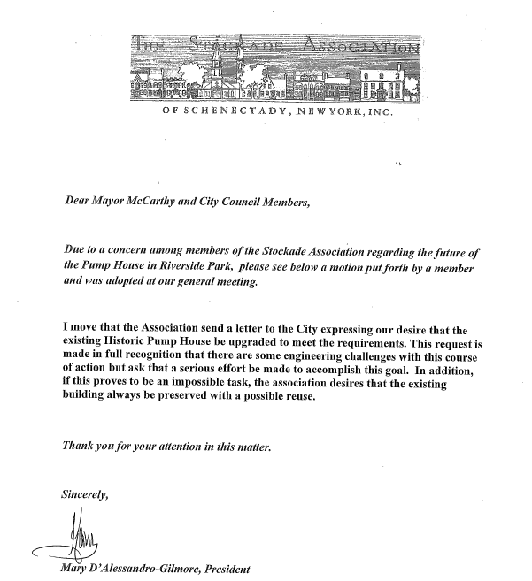 Note: Despite it Constitution and By-Laws, which commit the Stockade Association to protecting and preserving the residential nature of the Stockade district and to improve Riverside Park, the Stockade Association Board never notified the Association members or the neighborhood for two months after the March 1 presentation to them of the Project design. Moreover, in 2014, the Stockade Association president never put on the agenda or gave information to the Association and neighborhood about, the resolution before the City Council to place the Pumping Station in the Park rather than elsewhere, and rather than retrofitting the Old Pump House. When a motion by an SA member passed at the May 2014 general meeting, asking that a letter be sent to the Mayor concerning the Old Pump House and attempting to reuse it if technically feasible, the dismissive, minimalist, undated, informal note to the Right was sent to the Mayor and City Council. The matter was never again mentioned in the Stockade Spy or on the SA website in 2014.