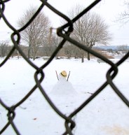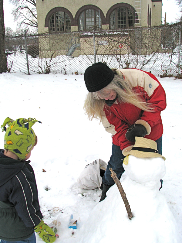above: [L] Loraine and Devin make his first snowman just outside the fence of 29 1/2 Front Street, in 2009; [R] Devin’s snowman is a lone sentinel outside the fence of 29 1/2 Front Street, echoing the famous, feckless snowmen at the gates of the Stockade the night of the 1690 Massacre.