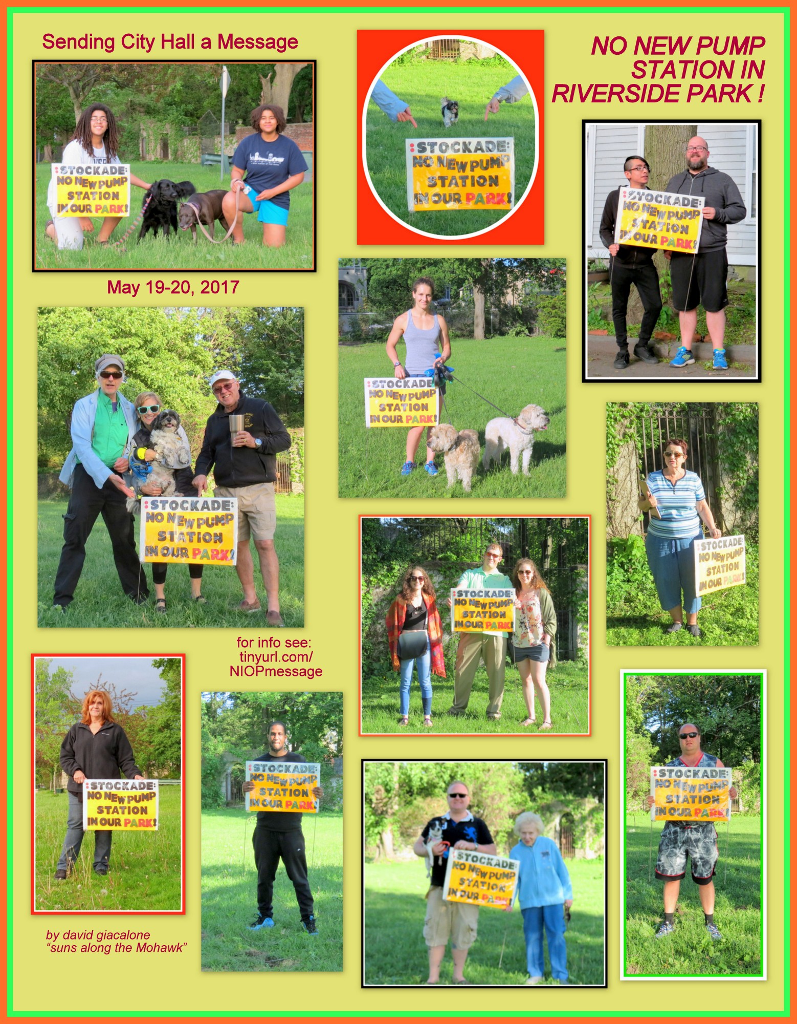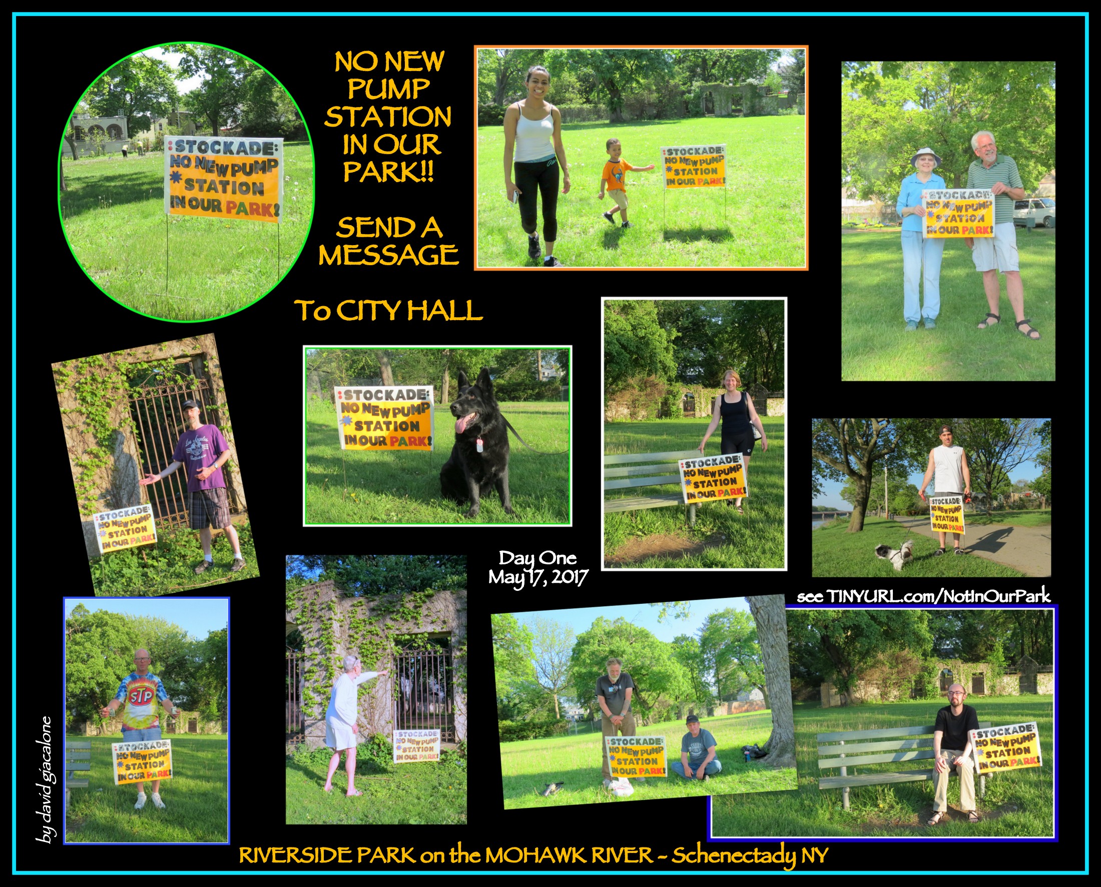 above: [L]. . Day 2 Collage … [R] Days 3 & 4 Collage. .Please let the folks in Schenectady’s City Hall know if you agree with our message that there should be No New Pump Station in Riverside Park — instead, retrofit or upgrade the Old Pump Station on its own parcel, or put a new sewage pump station in the extra space on that lot, or elsewhere, outside our Park.