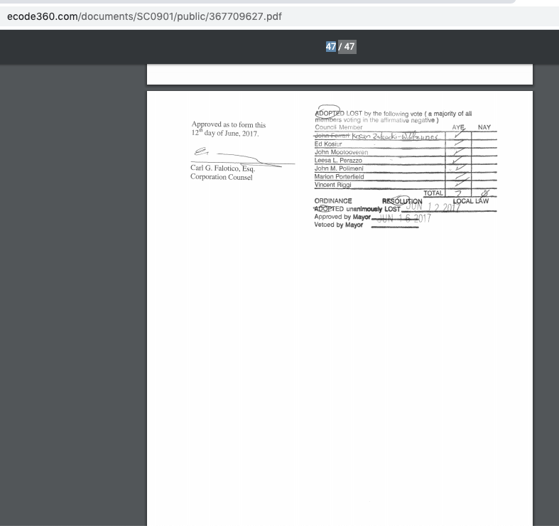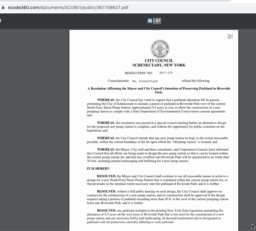The following resolution, Res. 2017-179, A Resolution Affirming the Mayor and City Council’s Intention of Preserving Parkland in Riverside Park, was passed unanimously by the City of Schenectady City Council, June 12, 2017 (and see it on the City Code website, at 46-47):